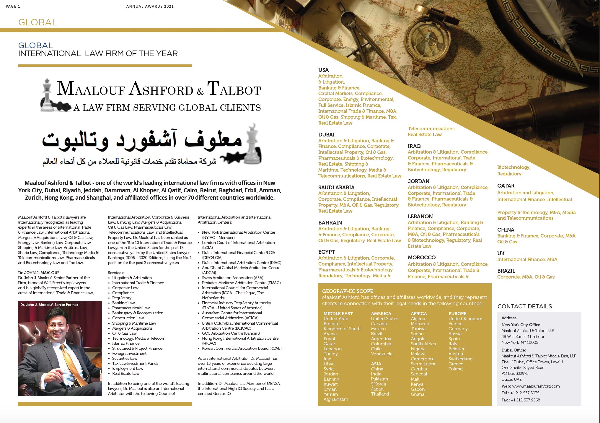 Dr. John J. Maalouf, Senior Partner of the Firm, is one of Wall Street’s top lawyers and is a globally recognized expert in the areas of International Trade & Finance Law, International Arbitration & Litigation, Corporate & Business Law, Banking Law, Mergers & Acquisitions, Oil & Gas Law, Pharmaceuticals Law, Telecommunications Law, and Intellectual Property Law.