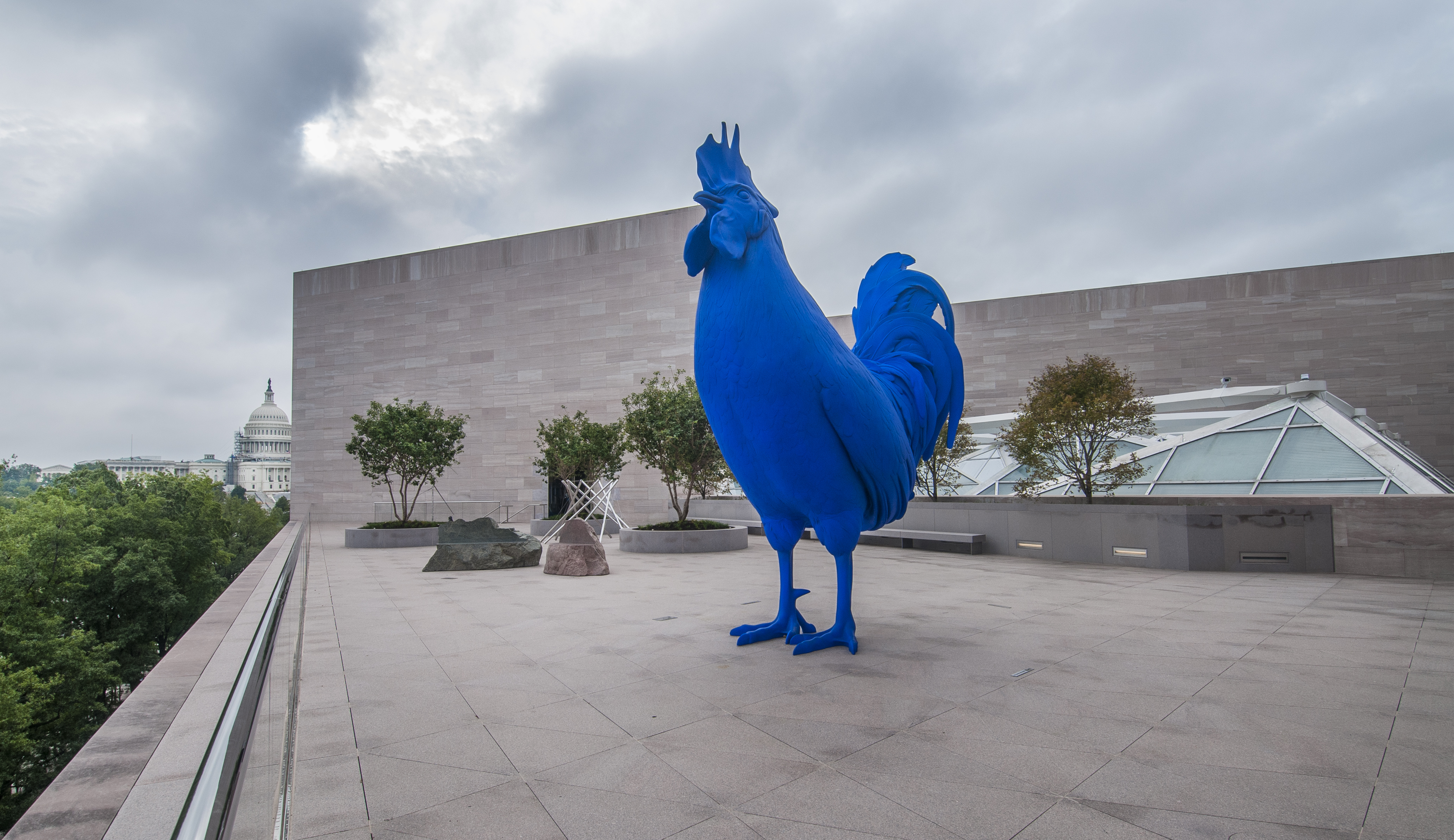 Following its display in London, Hahn/Cock made its American debut in July 2016 on the East Building’s new Roof Terrace as a long-term loan from Glenstone Museum in Potomac, Maryland, to the National Gallery. On view continuously since, Fritsch’s sculpture is installed directly on the terrace without a pedestal, allowing visitors to view every detail of the rooster from its fluffed tail feathers to the magnificent comb on its head. Alongside other highlights of modern and contemporary sculpture by artists including Nam June Paik and Scott Burton, the rooster stands sentinel facing out over Pennsylvania Avenue, with a view of the Capitol to the east. In April 2020, the work was illuminated, along with the West Building facade and crystals in the 4th Street Plaza, as part of the #LightItBlue campaign to honor the dedication and effort of essential workers, including the National Gallery’s own security and facilities staff.