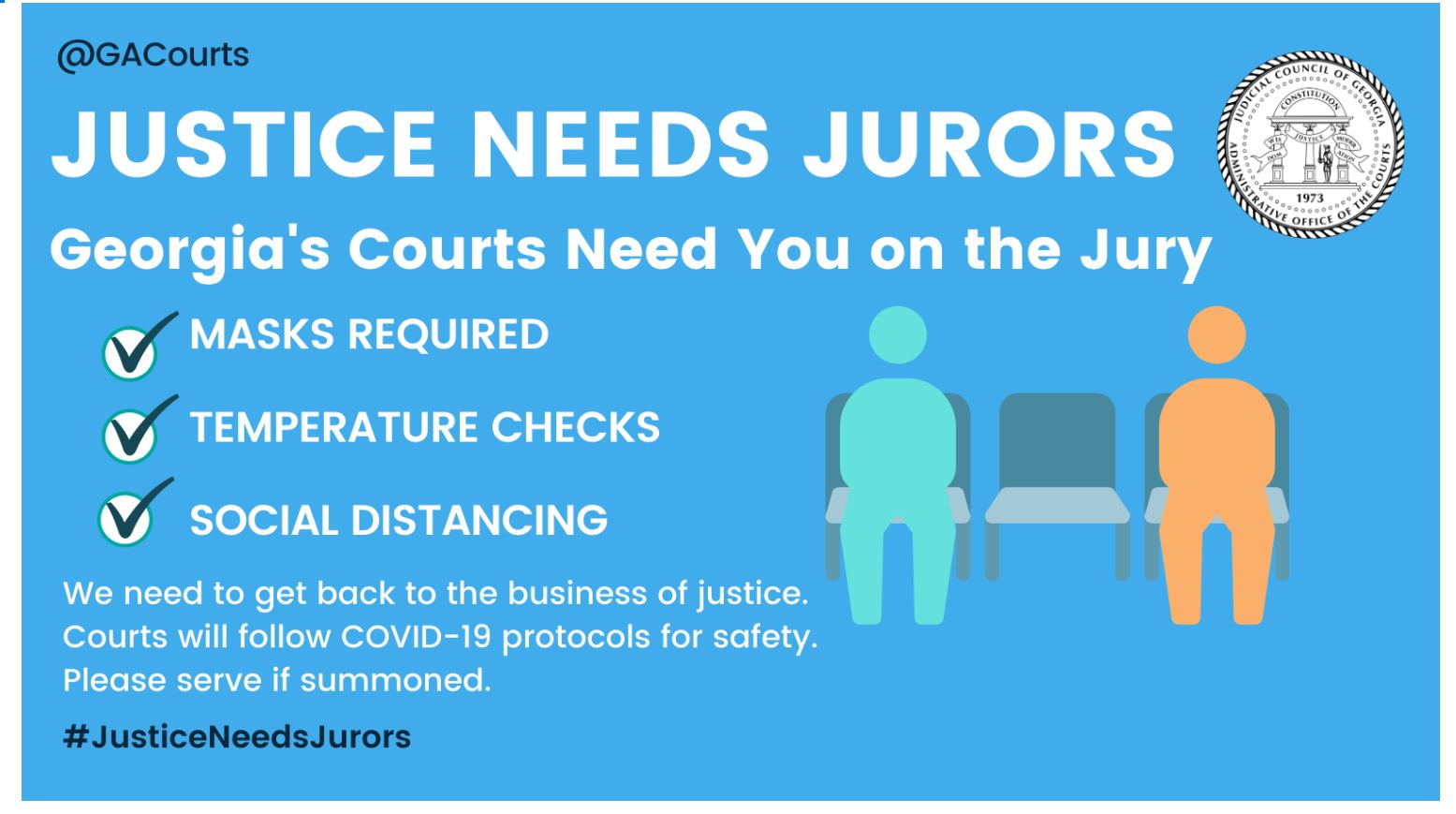 Entitled “Justice Needs Jurors,” the series of video messages began airing on TV stations across Georgia and streaming platforms in March. The PSAs emphasize the need for citizens to serve as jurors while assuring them that reasonable measures are being taken to protect their health and safety.