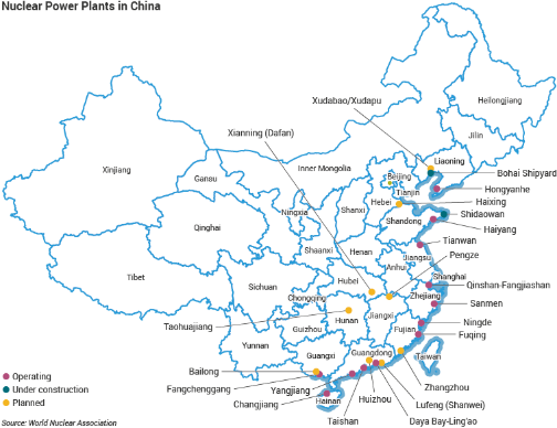 China is by far the world’s most active builder of nuclear power with plans to surpass the U.S. as the world’s top producer of nuclear energy by as early as 2030, and expects that nuclear power will account for about 10% of the country’s total electricity generation capacity by 2035 as the country shifts away from coal. China currently has 50 nuclear power plants in operation (48,659 MWe), 15 under construction (14,745 MWe), 39 planned (43,085 MWe), and 168 proposed. Each of these nuclear power plants going into operation requires about $10 million worth of radiation and detection equipment.