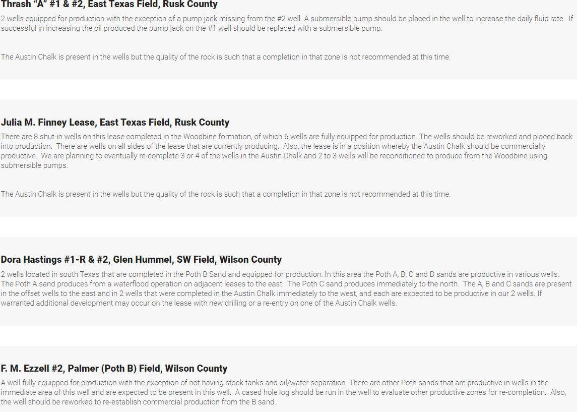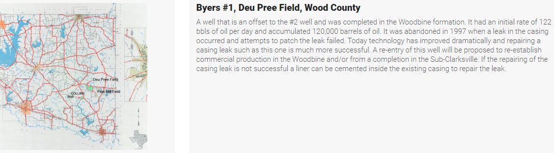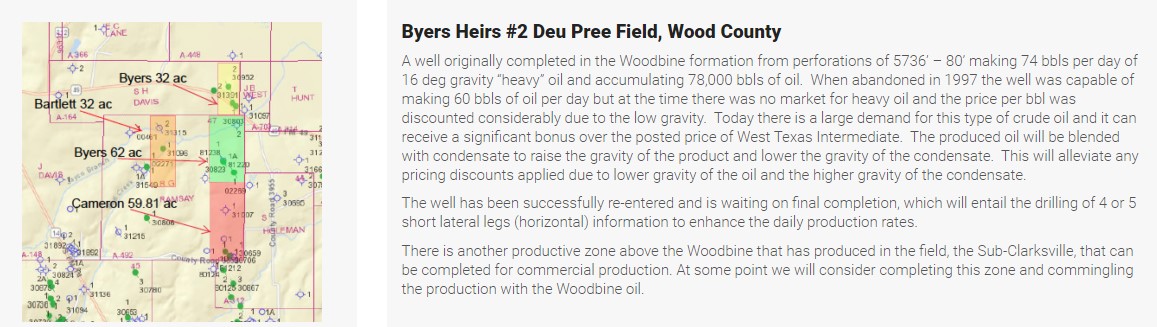 The Byers Heirs #2 Well has been successfully re-entered and is waiting on final re-completion, which will entail the drilling of 4 or 5 short lateral legs (horizontal) to enhance the daily production rates. These lateral legs are capable of increasing production from two to five times the initial daily rate. The Company predicts that sometime in late February or early March the Company will place a work-over rig at the site. Timing is dependent on crew availability.