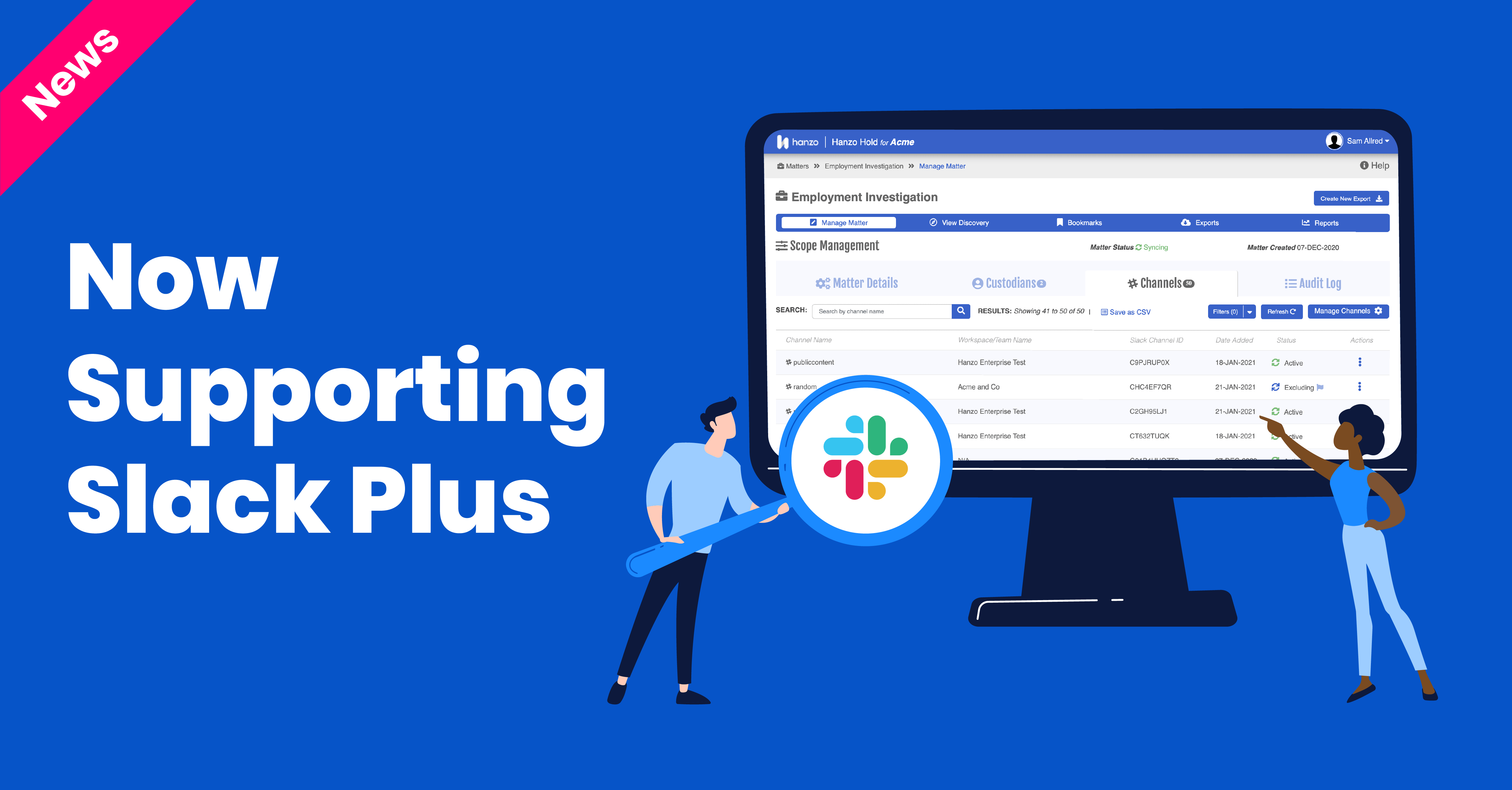 New York, NY, March 23, 2021 (GLOBE NEWSWIRE) -- Hanzo, a company known for its pioneering technology in dynamic web content preservation from enterprise collaboration applications and complex websites, today announced support for Slack Plus with their purpose-built discovery solution, Hanzo Hold for Slack.