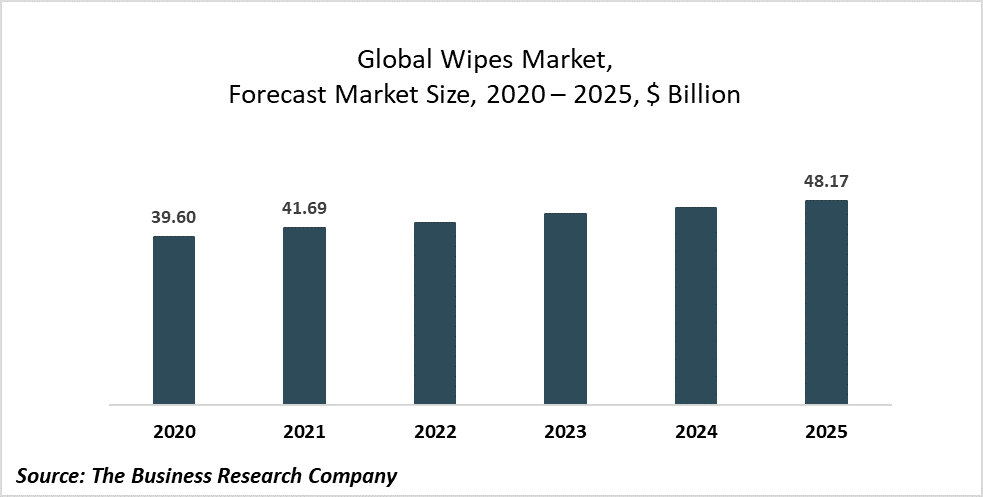 The global wipes market is expected to grow from $39.6 billion in 2020 to $41.69 billion in 2021 at a compound annual growth rate (CAGR) of 5.3%. The growth is mainly due to the companies resuming their operations and adapting to the new normal while recovering from the COVID-19 impact, which had earlier led to restrictive containment measures involving social distancing, remote working, and the closure of commercial activities that resulted in operational challenges. The global wipes market is expected to reach $48.17 billion in 2025 at a CAGR of 4%.
