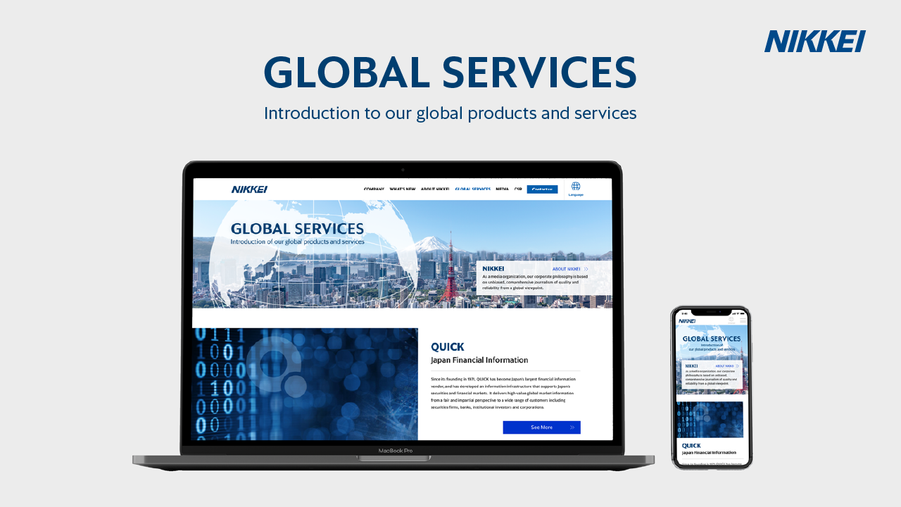 TOKYO, JAPAN, April 1, 2021 /EINPresswire.com/ -- Nikkei Inc. launched "Global Services," a new site on the English version of its corporate website. The services provided by the Nikkei Group result in business solutions for overseas customers. We will use the "Global Services" site to introduce a variety of our services and provide information to our overseas customers who are not familiar with Nikkei.