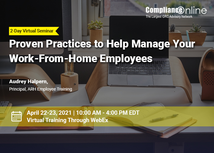 SAN JOSE, CA, UNITED STATES, March 29, 2021 /EINPresswire.com/ -- Registration is now open for ComplianceOnline’s 2-day virtual Seminar ‘Best Practices to Help Manage Your Work-from-home Employees’ for all leaders working or managing a remote or dispersed team of employees. The seminar will be held on April 22-23, 2021 (10:00 AM - 4:00 PM EDT).