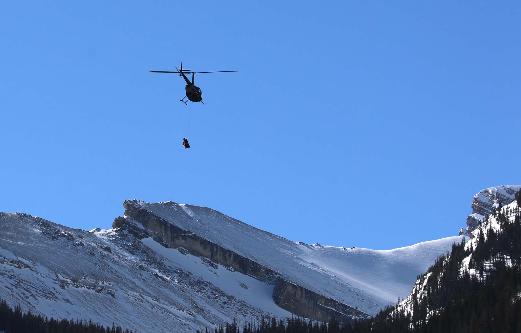 A professional wildlife capture crew brings in two captured ewe bighorn sheep that will be swapped out for two newly-collared ewes that will be ferried back to their capture location.