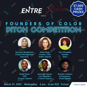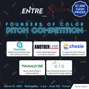 PITTSBURGH, PENNSYLVANIA, USA, March 30, 2021 /EINPresswire.com/ -- Entre, one of the fastest growing communities for entrepreneurs, is teaming up with X-Factor Capital to host its Founders of Color Pitch Competition on March 31st from 6-8pm ET. This will mark Entre’s third diversity and inclusion focused event. The $7,000+ in Equity-Free Cash Grants is one step for both Entre and X-Factor Capital towards making tech and startups a more equitable ecosystem for all.“At Entre, our mission is to make entrepreneurship accessible and inclusive for everyone. Diversity focused events like these have been a core part of our mission and have shown to be incredibly impactful. We realized the impact from the 700+ attendees at our Black Led Startup Pitch Competition we hosted in the summer of 2020.” said Michael Marra, CEO and Founder of Entre. One of the Startup finalists of the Black Led Startup Pitch Competition, Undock, went and raised $1.6 million only a few months later.