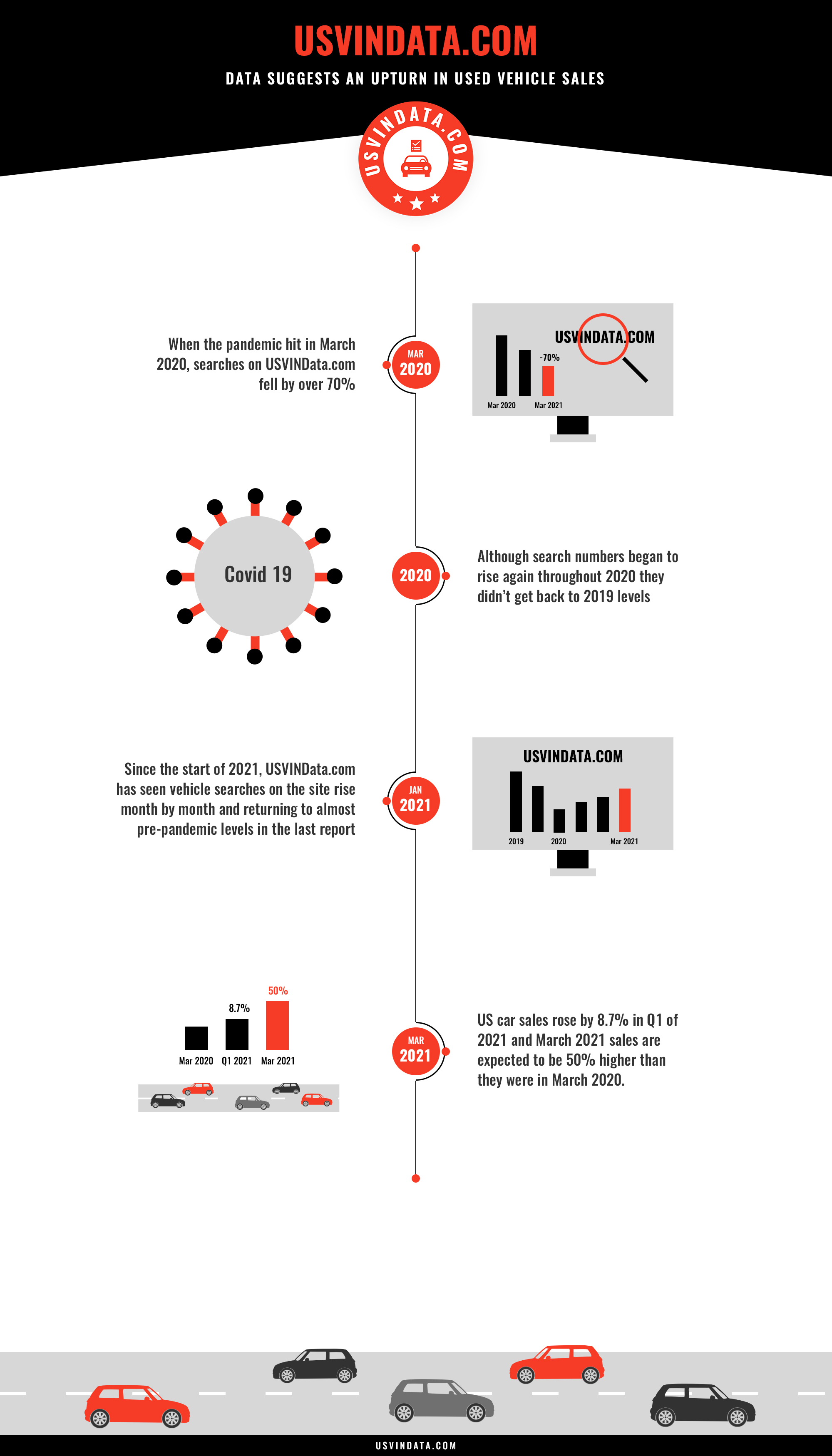 MAR VISTA, CALIFORNIA, UNITED STATES, April 5, 2021 /EINPresswire.com/ -- Since the pandemic began, a year ago, searches on leading vehicle records site, USVINData.com have fallen as the used car sales market has fallen away but the latest figures show a rise in searches which is good news for used vehicle sellers.When the pandemic and associated restrictions hit in March 2020, searches on USVINData.com fell by over 70%, and although they began to rise again throughout the year they didn’t get back to 2019 levels. This has broadly reflected trends seen across the used vehicles sales industry.