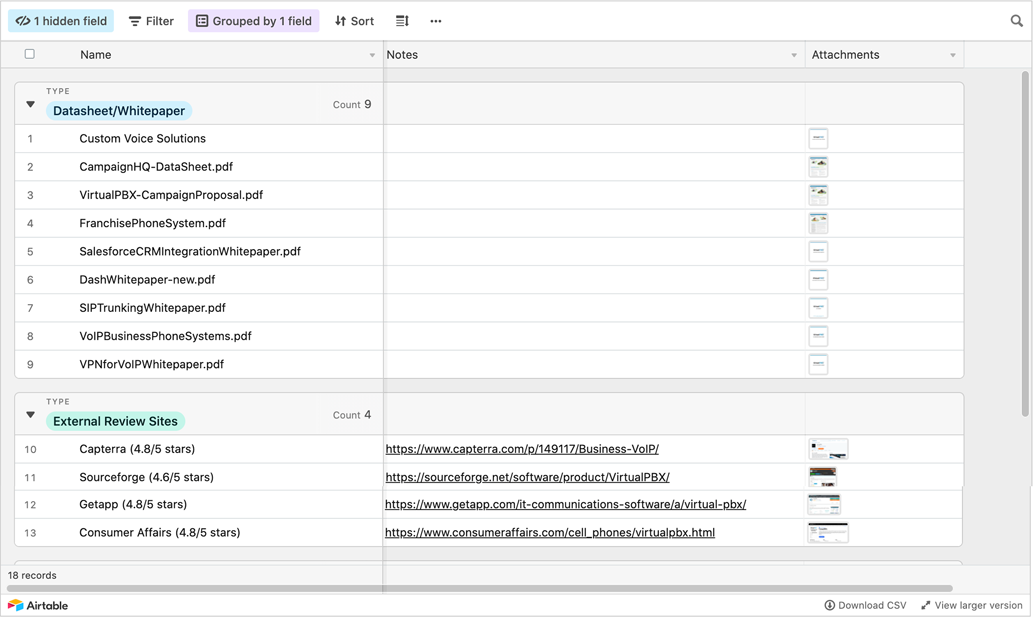 Partners may also want to display our external review sites like Capterra and Sourceforge alongside more concrete materials like whitepapers. Review sites are also shown with a description and attached screenshot, and of course offer links to those sites so they can be further explored by partners and shown as updated representations of VirtualPBX performance as a company.