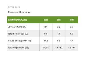 - The average 30-year fixed-rate mortgage is expected to be 3.2 percent in 2021 and 3.7 percent in 2022.
