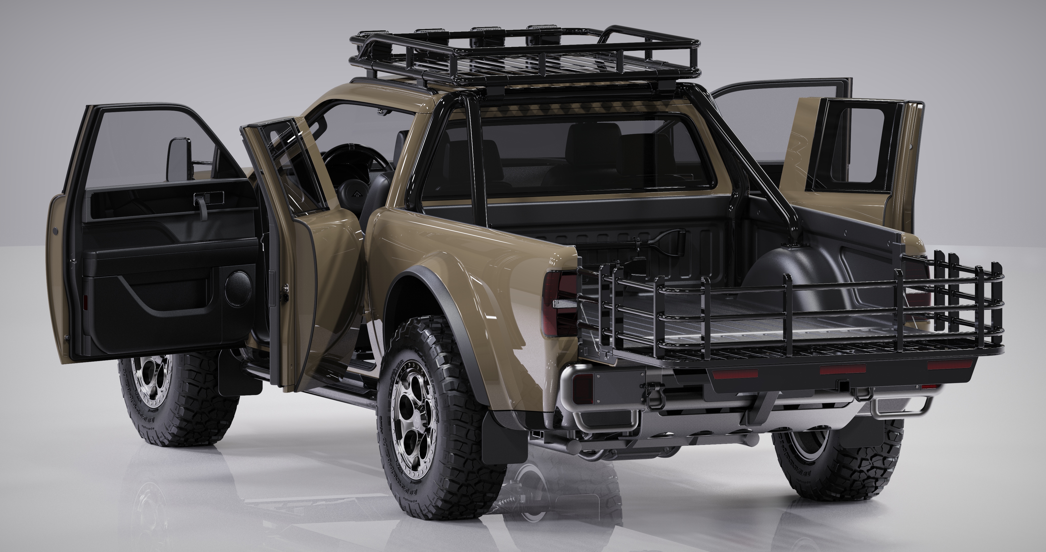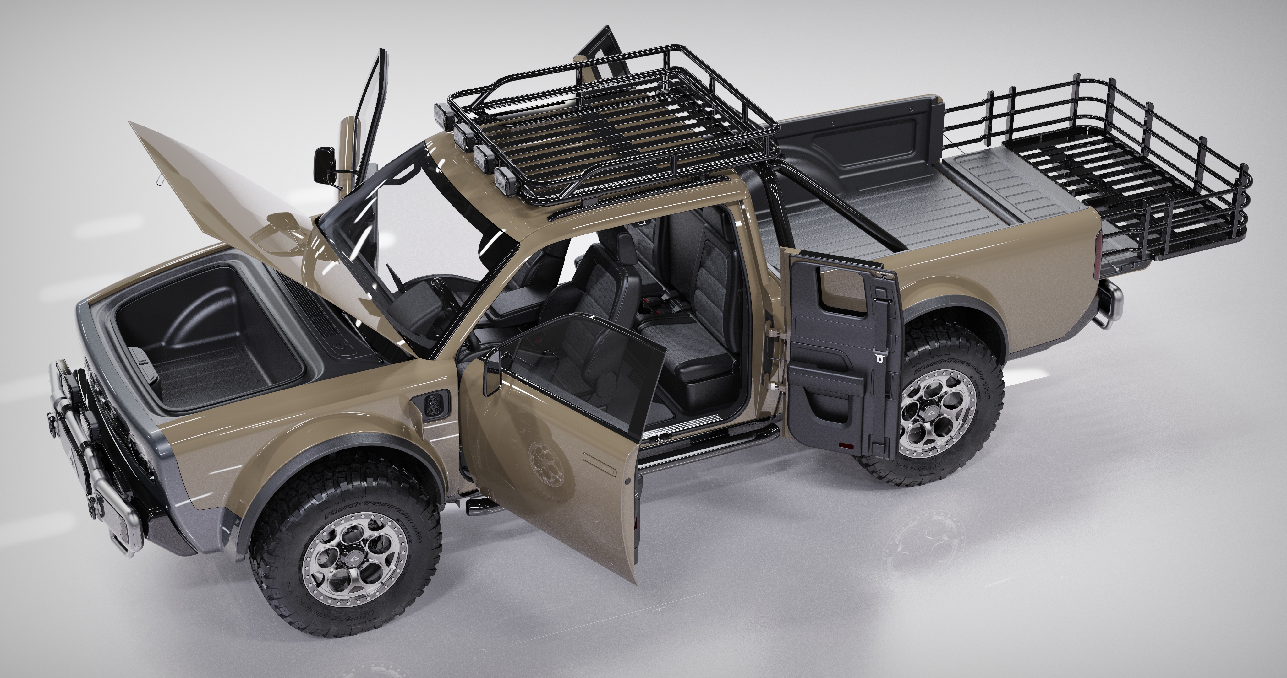 WOLF+™ puts an additional emphasis on utility, while preserving the persona of Alpha’s revolutionary WOLF™ electric truck. The multipurpose WOLF+™ is built for utility and adventure. It has an extended cabin that accommodates four passengers, with access provided through two full-size doors for the driver and front passenger, and two three-quarter size doors that hinge backwards for open rear seat occupancy.