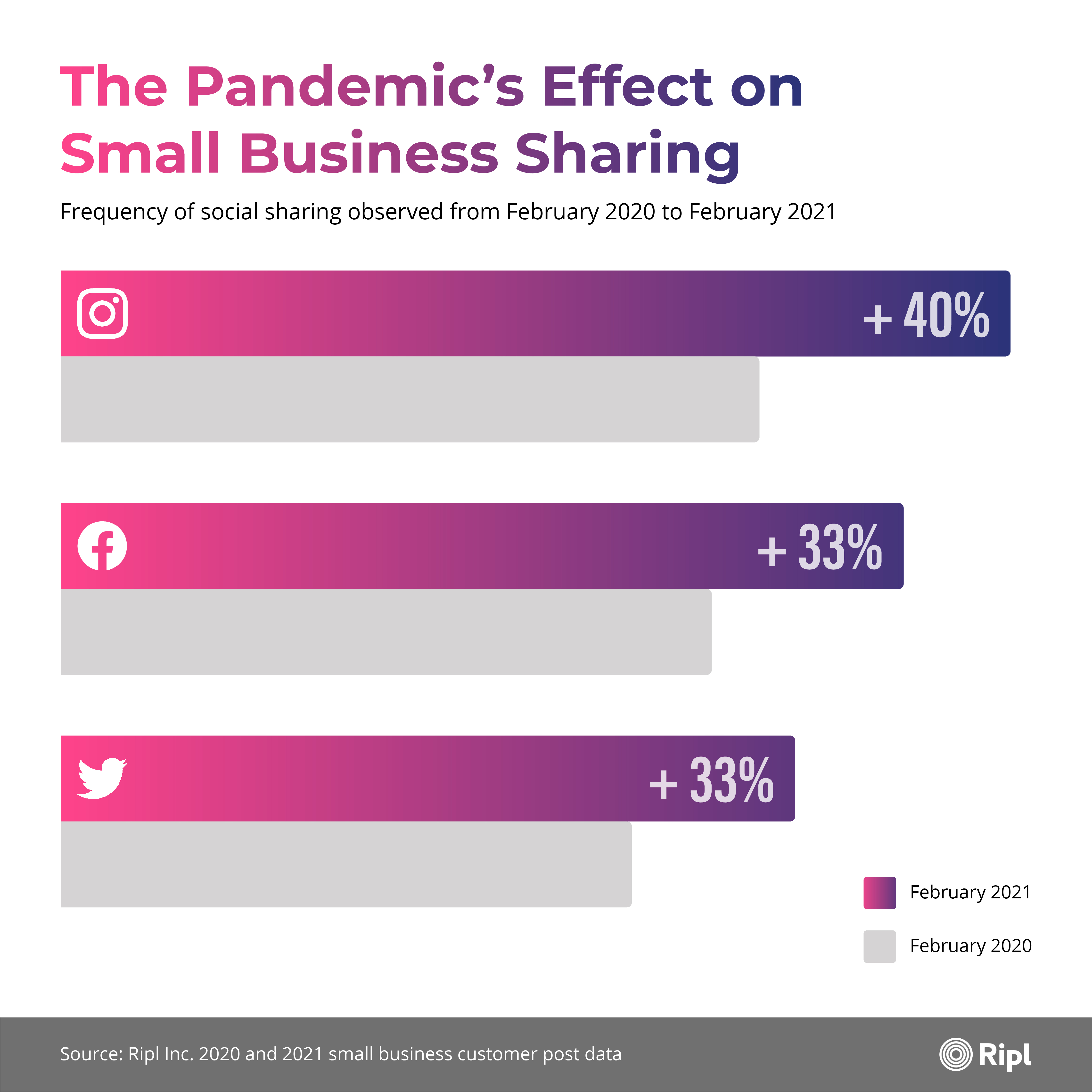 “Without a doubt the COVID-19 pandemic has forced small businesses to increase activity on social media. We are seeing this across social platforms, but it is most prevalent with regard to Instagram where we have witnessed a 40% increase in frequency of sharing. Additionally, we saw a 33% increase in Facebook and Twitter sharing over the same year-long period,” said Clay McDaniel, CEO of Ripl.
