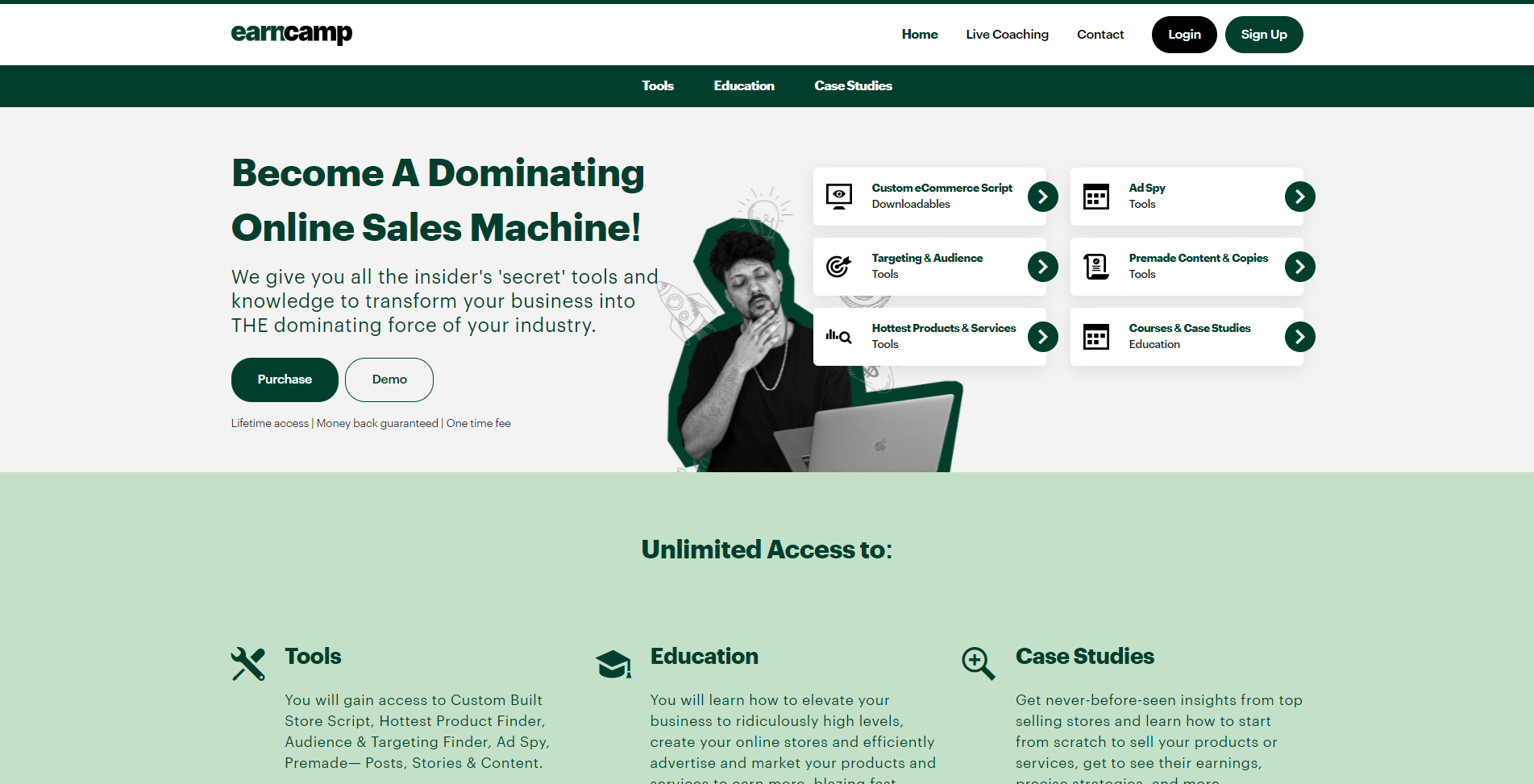ALANYA, TURKEY, April 19, 2021 /EINPresswire.com/ -- Earn Camp is pleased to announce the launch of its platform where users can get education, access to marketing and analytic tools, custom made ecommerce scripts, and more. On a mission to put everything a business owner may need on a single platform, the company charges a reasonably-priced one-time fee for lifetime access.“We are excited to announce that we are finally up and running,” says company founder Caner Ozdemir. “We have been working on Earn Camp for almost two years at this point, and are proud of what we have accomplished.”