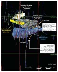 KHDDH565 remains in progress at a depth of 1,300m. Final assays for the remainder of the drill hole are expected in mid-May.