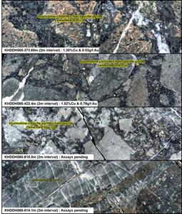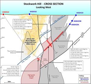 Drill hole KHDDH564 was designed as a large-scale step out (400m to the south), targeting a repeat of the high-grade bornite zone at Stockwork Hill (Figure 1). The hole has been completed and assays have been returned to 1,305m (Figure 1 and 2).