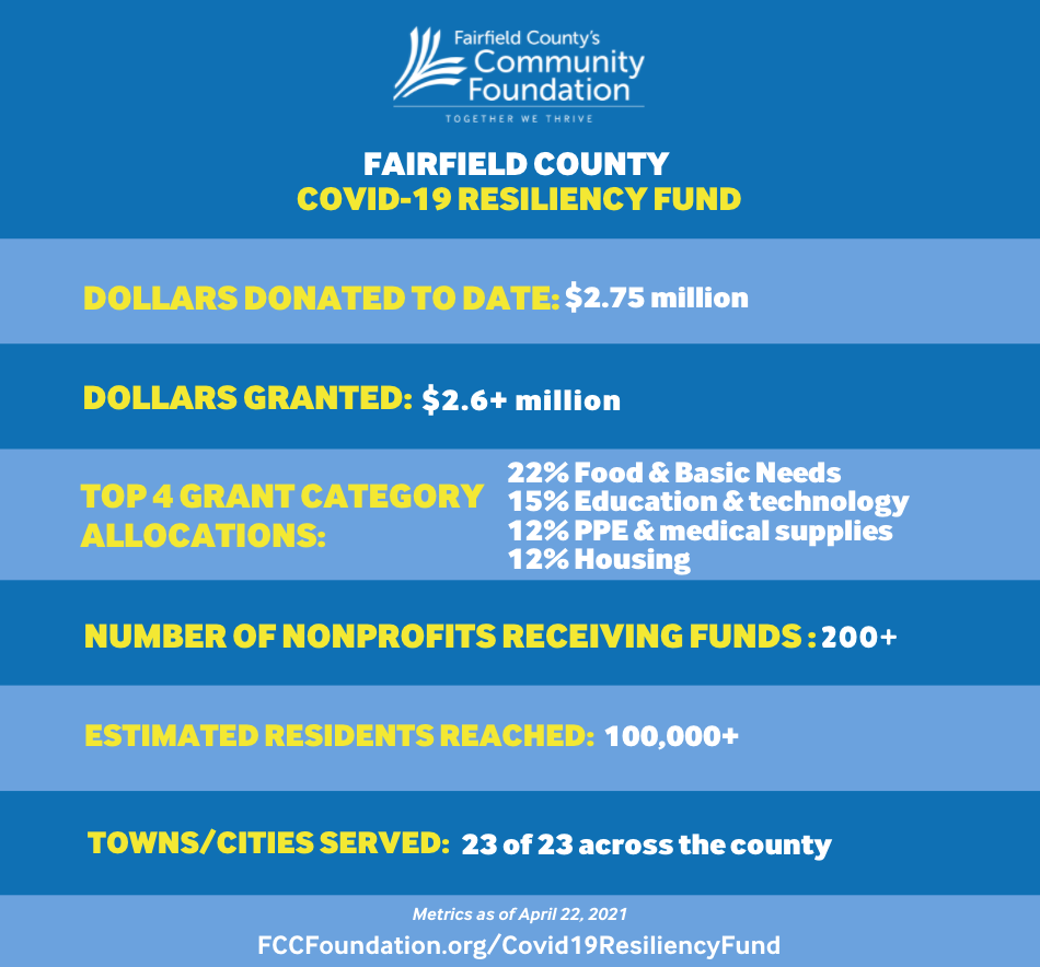Fairfield County’s Community Foundation launched the Fairfield County COVID-19 Resiliency Fund on March 18, 2020, just days after the first state shutdowns, in an effort to help minimize the social and economic consequences of the global pandemic and mitigate the widening of disparities in education, employment, housing, and health. To date, the Fund has received approximately $2.75 million in donations and distributed over $2.6 million in grant funding to more than 200 local nonprofit organizations. A full list of Resiliency Fund grantees awarded to date with brief descriptions of funding purposes can be found here: https://fccfoundation.org/ways-to-give/covid19resiliencyfund/resiliency-fund-nonprofits-receiving-funds/