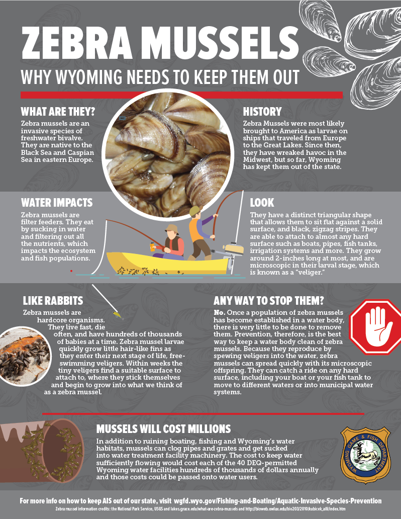 “We’re very concerned about the spread of invasive zebra mussels to our natural waters,” said Josh Leonard, Game and Fish AIS coordinator. “We’re doing all we can to monitor the presence of zebra mussels in Wyoming, so please don’t be afraid to contact us if you notice anything strange while out this spring and summer.”