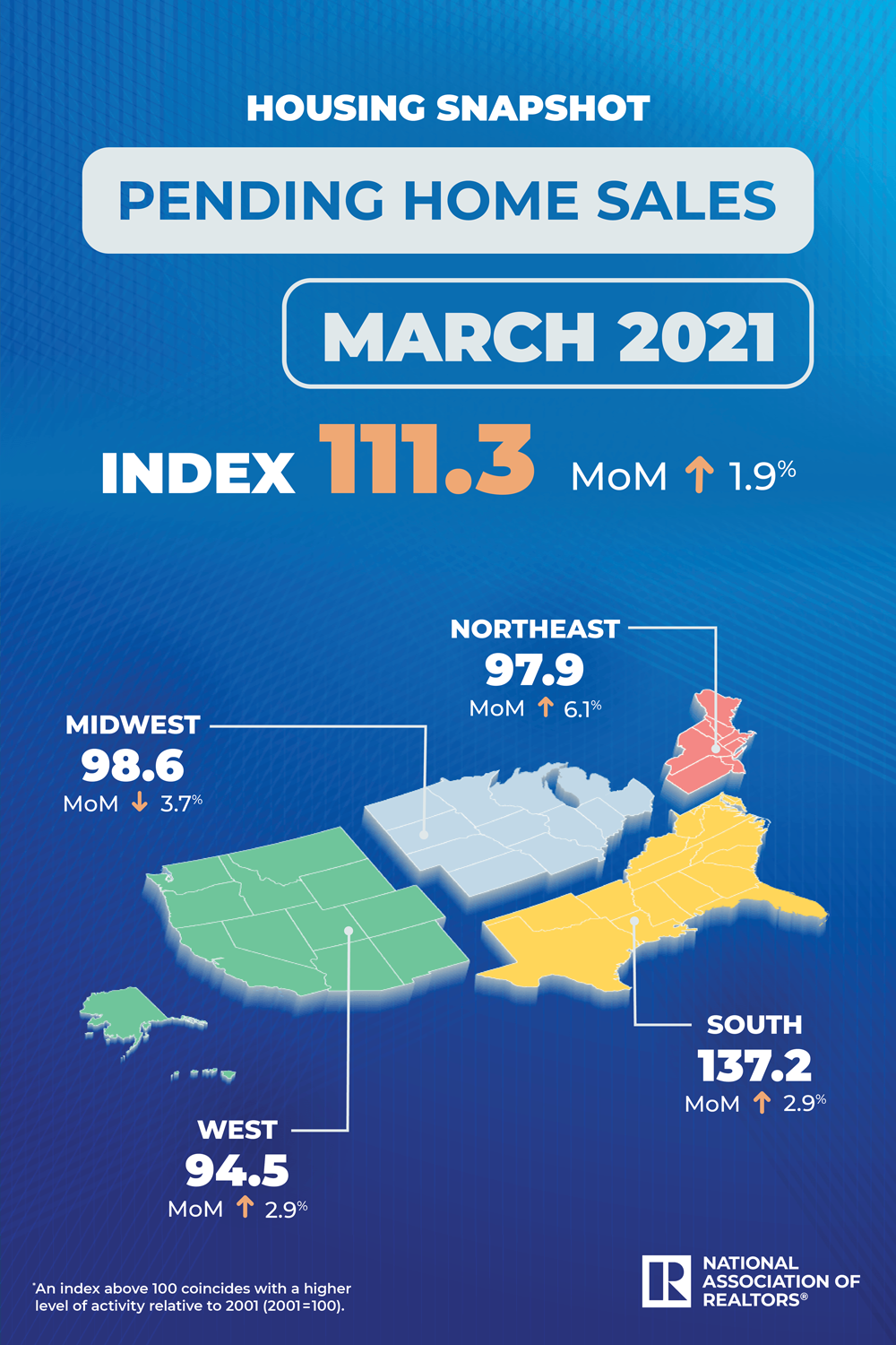 Pending home sales transactions in the South jumped 2.9% to an index of 137.2 in March, up 27.9% from March 2020. The index in the West grew 2.9% in March to 94.5, up 29.8% from a year prior.