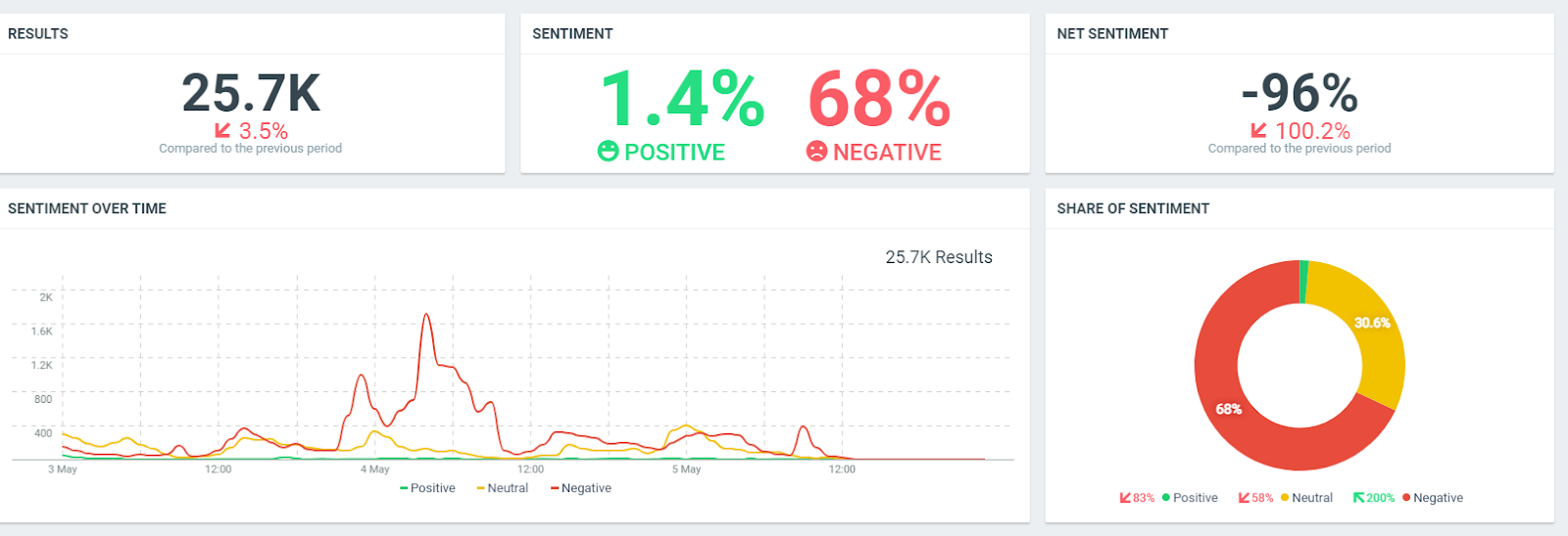 O Centro de Estudos de ReputationUp também calculou o sentimento líquido gerado por Iván Duque na Internet. Esta é a percentagem líquida, medida numa escala de -100 a 100. Os resultados podem ser verificados no gráfico seguinte. O sentiment negativo é de 68%. Quanto ao positivo, é apenas 1,4%. Isto gera um sentimento líquido de -96%. Por causa dos protestos, o sentimento líquido caiu, em um único dia, de 100,2%. A evolução dos resultados refere-se às interações em um determinado período. Nas últimas horas foram produzidos quase 26.000 resultados.