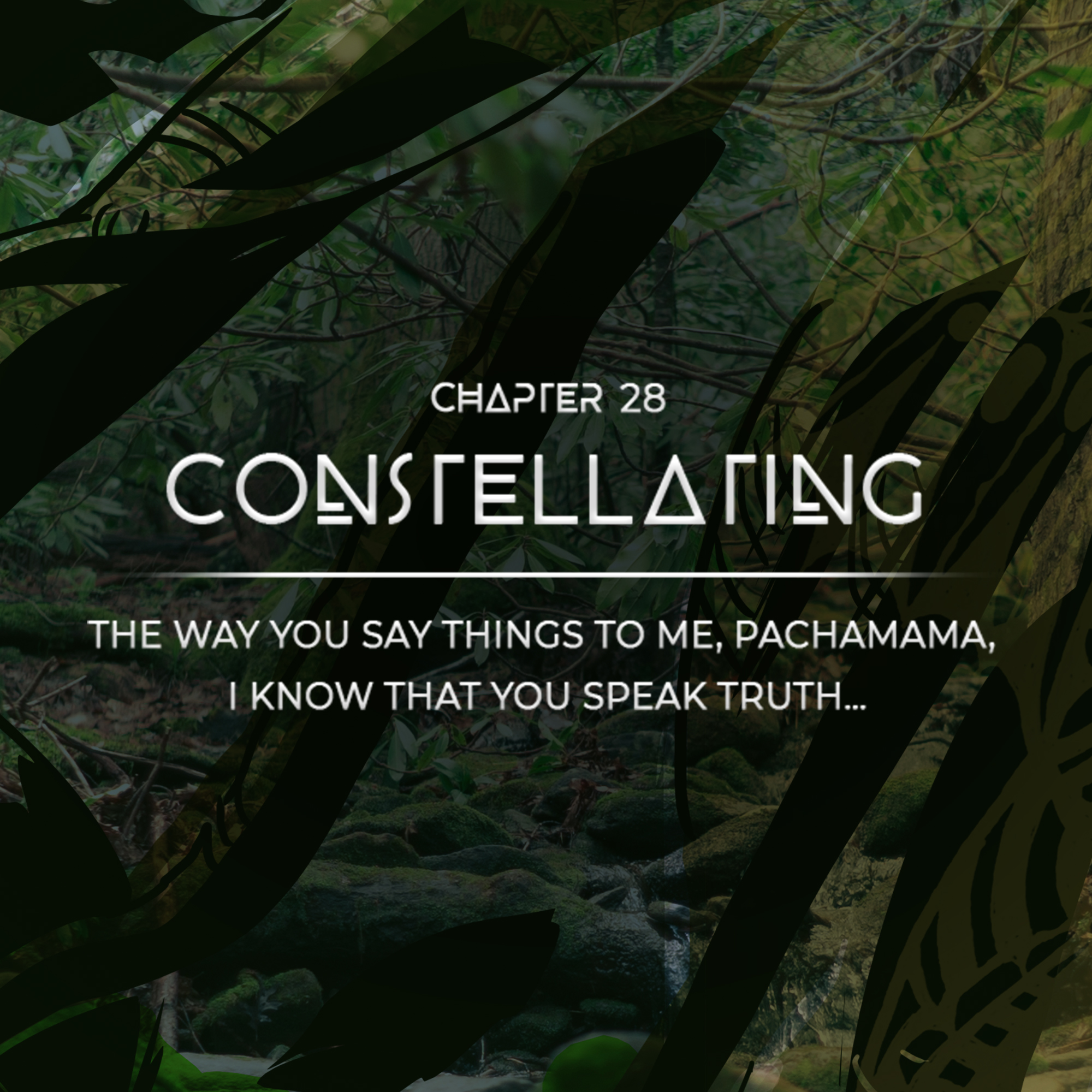 Sir David said “The medicines are so important to the expansion of C.W.'s consciousness, but it is critical to have spiritual mentors to provide guidance. In this chapter, C.W. is ready to understand his true identity but needs assistance in recognizing it... Pachamama never tells C.W. who he is, but rather is coaching him to realize it for himself. As Joseph Campbell once said, “We have not even to risk the adventure alone, for the heroes of all time have gone before us. We need only follow the thread of the hero's path...” Here, we have made that illustration real in the relationship between C.W. and creation.