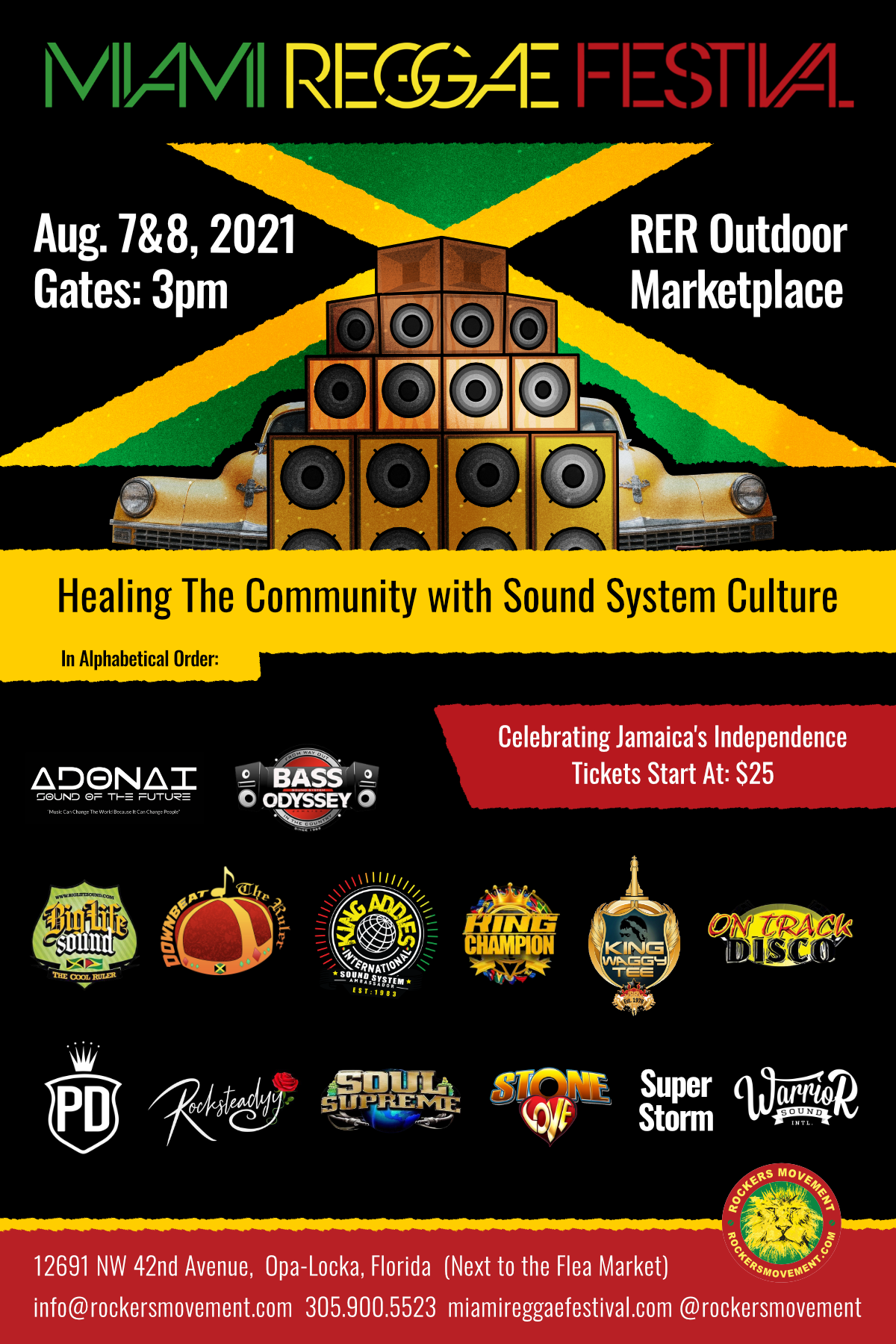 MIAMI, FL, UNITED STATES, May 11, 2021 /EINPresswire.com/ -- Miami Reggae Festival weekend takes place on Saturday, August 7th and Sunday, August 8 th, 2021.In their seventh year of presenting Miami Reggae Festival, Rockers Movement goes back to basics with a shift toward Jamaica’s Sound System Culture in solidarity, building on the foundation of the positive vibrations of Reggae and symbolizing the self determination of our communities to survive. The Annual Miami Reggae Festival 2021 celebrates the 59th year of Jamaica's Independence with a call for healing the community and featuring some of the very best of Sound Systems (in alphabetical order): Adonai Sound, Bass Odyssey, Big Life Sound, Downbeat The Ruler, King Addies International, King Champion, King Waggy Tee, Ontrack Disco, Poison Dart, Rocksteadyy, Soul Supreme, Stone Love, Super Storm, Warrior Sound International and hosted by Mutabaruka.
