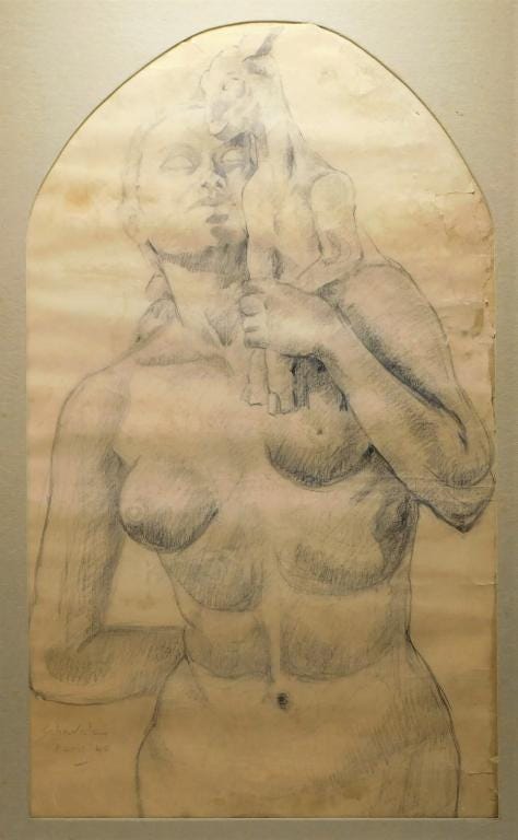 Nude figural drawing by Jehangir Sabavala (Indian, 1922-2011), graphite on paper, signed, annotated and dated with a sheet size of 27 ½ inches by 16 ¼ inches (est. $6,000-$9,000).