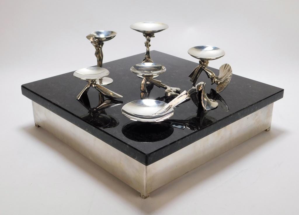 A seven-piece sterling silver seder set by Richard Fishman (R.I., b. 1941) carries a pre-sale estimate of $2,000-$3,000. The set (51.21 ozt.) includes six symbolic sterling silver plates for the salt water, maror, egg, karpas, charoset, and shank bone, with a black granite top over a triple plated brass box, opening to three shelves for the matzah. Each plate is marked "Sterling" on bottom, and all are numbered and initialed "4/15 RAF" on the bottom.