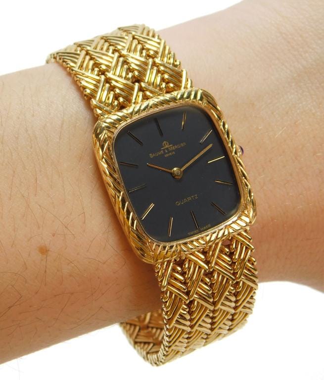 A Swiss Baume & Mercier 14kt gold ladies’ (or men’s) watch, having a steel gray face with decorative casing and matching scale pattern 14k gold wristband, is expected to slip around a new wrist for $2,000-$3,000. The stylish watch is marked "Baume & Mercier Geneve Swiss Made" on the face and is from the collection of a Rhode Island gentleman.