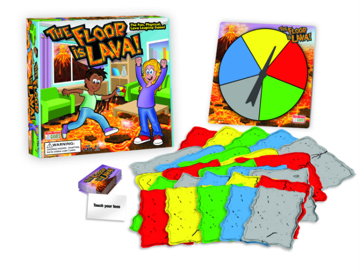 Many people know the impromptu game of shouting out “LAVA” and everyone jumping up onto nearby objects to get their feet off the ground. Endless Games created a format where players continue to imagine the floor is molten hot lava, but added play patterns using a spinner for color call-outs and having players jump along foam game pieces in order to reach safety. Challenge cards that enforce activities that can make it difficult not to fall into the lava come into play when landing on certain tiles.