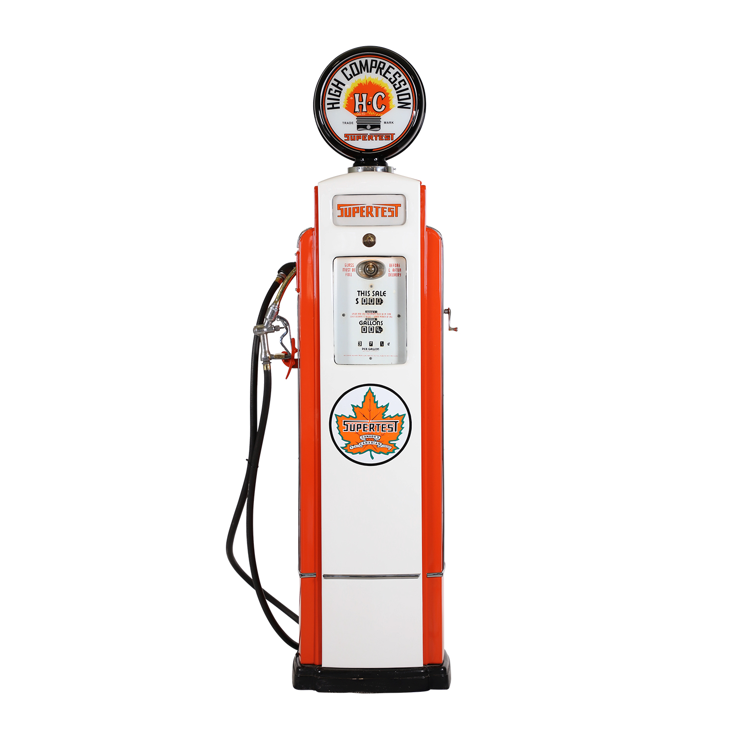 1940s Bennett 541 Supertest pump, professionally repainted to Supertest branding, 92 inches tall, new decals, hose and globe, and original ad glass and register dials (CA$20,060).