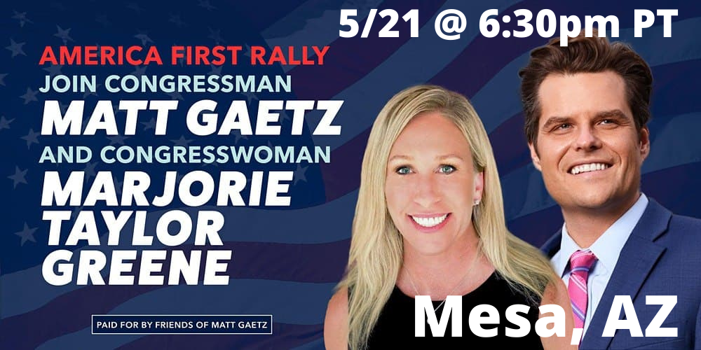 Notorious MTG - will be joined by Congressmen Matt Gaetz, Andy Biggs, Paul Gosar & a few other familiar faces on Friday May 21st @ 6:30pm PT. Tickets are FREE!