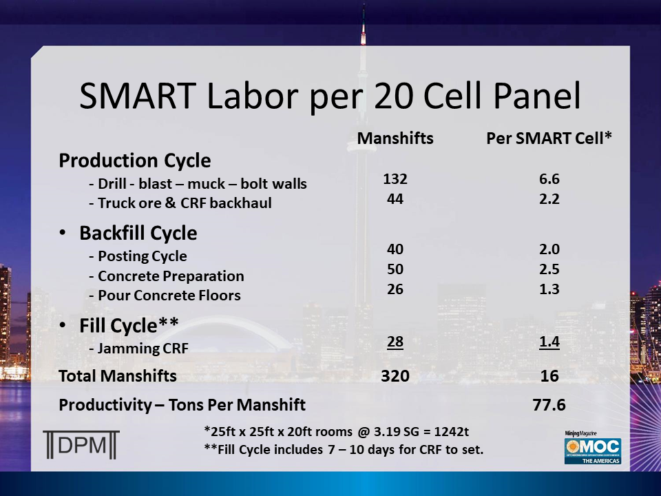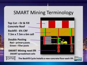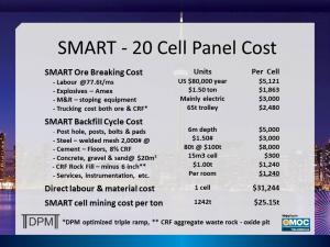 The SMART basic mine design is to load ore trucks at the face of a 15m wide panel, truck to surface, backhaul CRF on the return trip to fill a nearby panel. Mining multiple panels allow scheduling mining equipment at 100% of design capacity as working under a concrete roof eliminates most ground control delays. The labor and material components to mine a SMART panel are standardized thus costs can be adjusted and transferred from mine to mine.