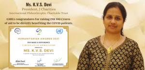 Ms. K.V.S. Devi, President of the renowned philanthropic public trust, J Charities is a Humanitarian Awardee for her contributions as a silent power house who was instrumental to procure medical benefits worth INR 100 Crores to the COVID patients in India during pandemic. When contacted over phone, Ms. Devi appreciated the organizers for recognizing the unsung heroes and their selfless efforts and dedicated this award to her team who has been working extensively round the clock since 2011. All the awardees expressed their happiness for receiving the awards.