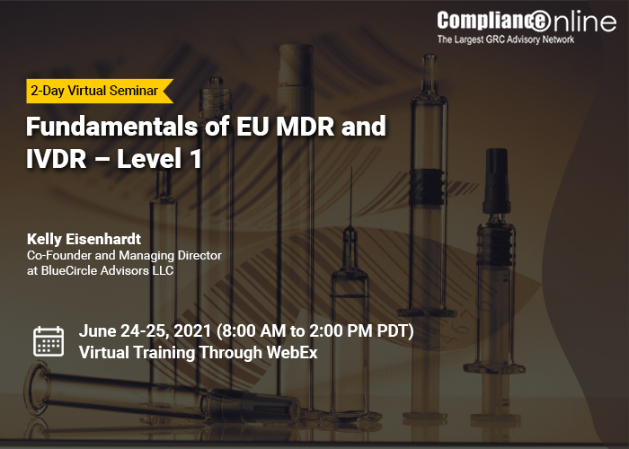 SAN JOSE, CA, UNITED STATES, June 15, 2021 /EINPresswire.com/ -- ComplianceOnline, the world’s leading provider of training for regulated companies is hosting a virtual seminar entitled ‘Fundamentals of EU MDR and IVDR’ for medical device companies. The seminar will be held on June 24-25, 2021, and will be presented by Kelly Eisenhardt Co-Founder and Managing Director at BlueCircle Advisors LLC.