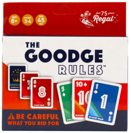 The Goodge Rules is an entertaining game with a different spin on a century-old family tradition, Spades. Made of quality, poker-sized cards like all Regal Games card games; The Goodge Rules is sure to bring the family together. It is a bidding game of strategy, wit, and luck, and is becoming a staple for family game night mayhem.