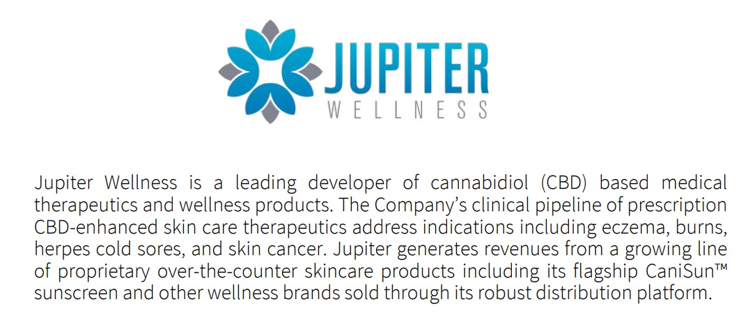 Jupiter Wellness, Inc. (NASDAQ: JUPW) is a leading developer of cannabidiol (CBD) based medical therapeutics and wellness products. The JUPW clinical pipeline of prescription CBD-enhanced skin care therapeutics address indications including eczema, burns, herpes cold sores, and skin cancer. JUPW generates revenues from a growing line of proprietary over-the-counter skincare products including its flagship CaniSun™ sunscreen and other wellness brands sold through its robust distribution platform.