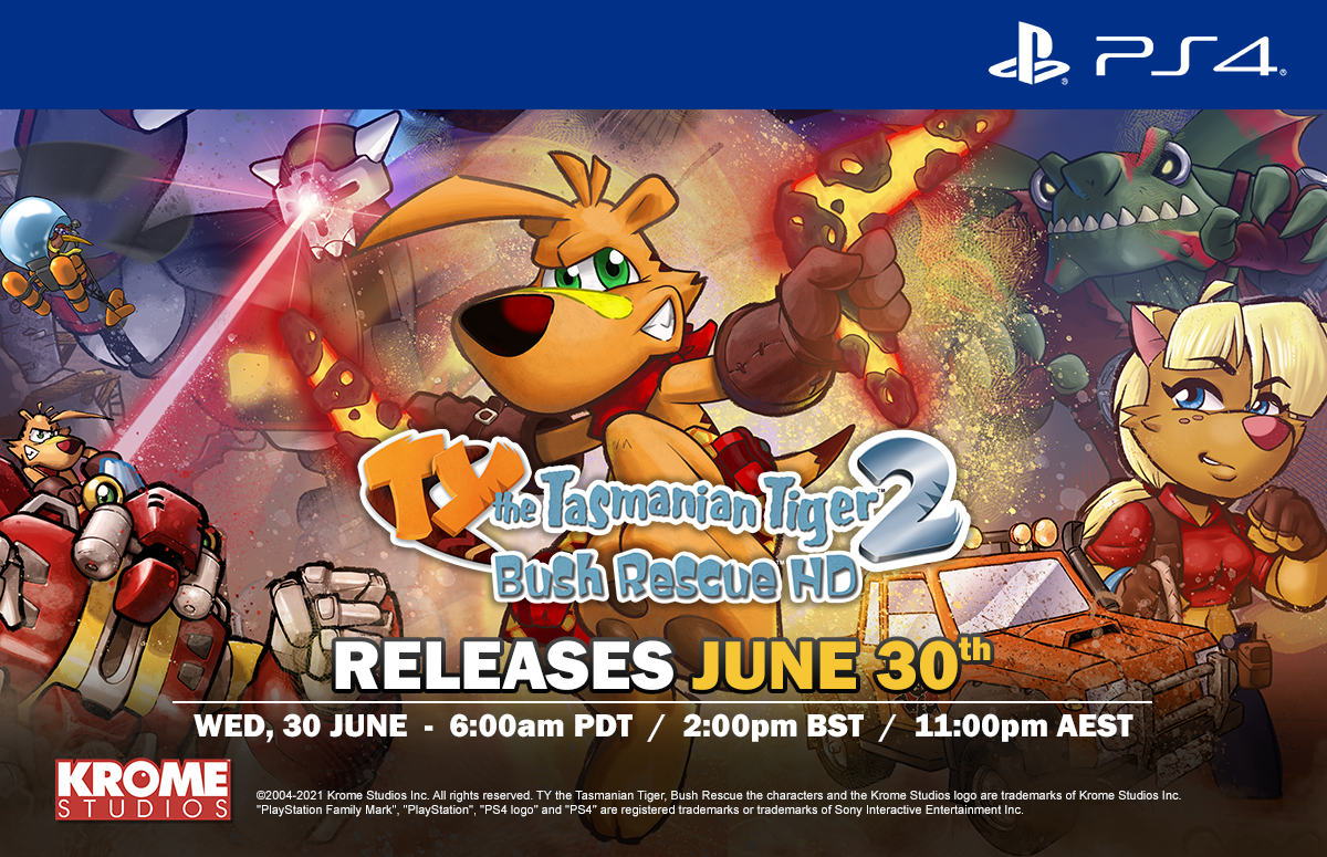 BRISBANE, AUSTRALIA, June 21, 2021 /EINPresswire.com/ -- You beauty! Krome Studios is proud to announce that their award-winning game, TY the Tasmanian Tiger™2: Bush Rescue™ is coming to PlayStation®4 systems, starting June 30, 2021. Return to your favorite Aussie mates with this nostalgic re-mastering of the platformer-genre classic.Fans of the TY the Tasmanian Tiger series boomeranged back for the popular sequel’s Kickstarter campaign, funding the project in a blazing 8.5 hours. One fan shared, “TY 2 was my introduction to TY and let's just say it's a real beauty mates!.” Another fan enthused, “This is my favorite platformer of all time, I've never been this excited for a game!”
