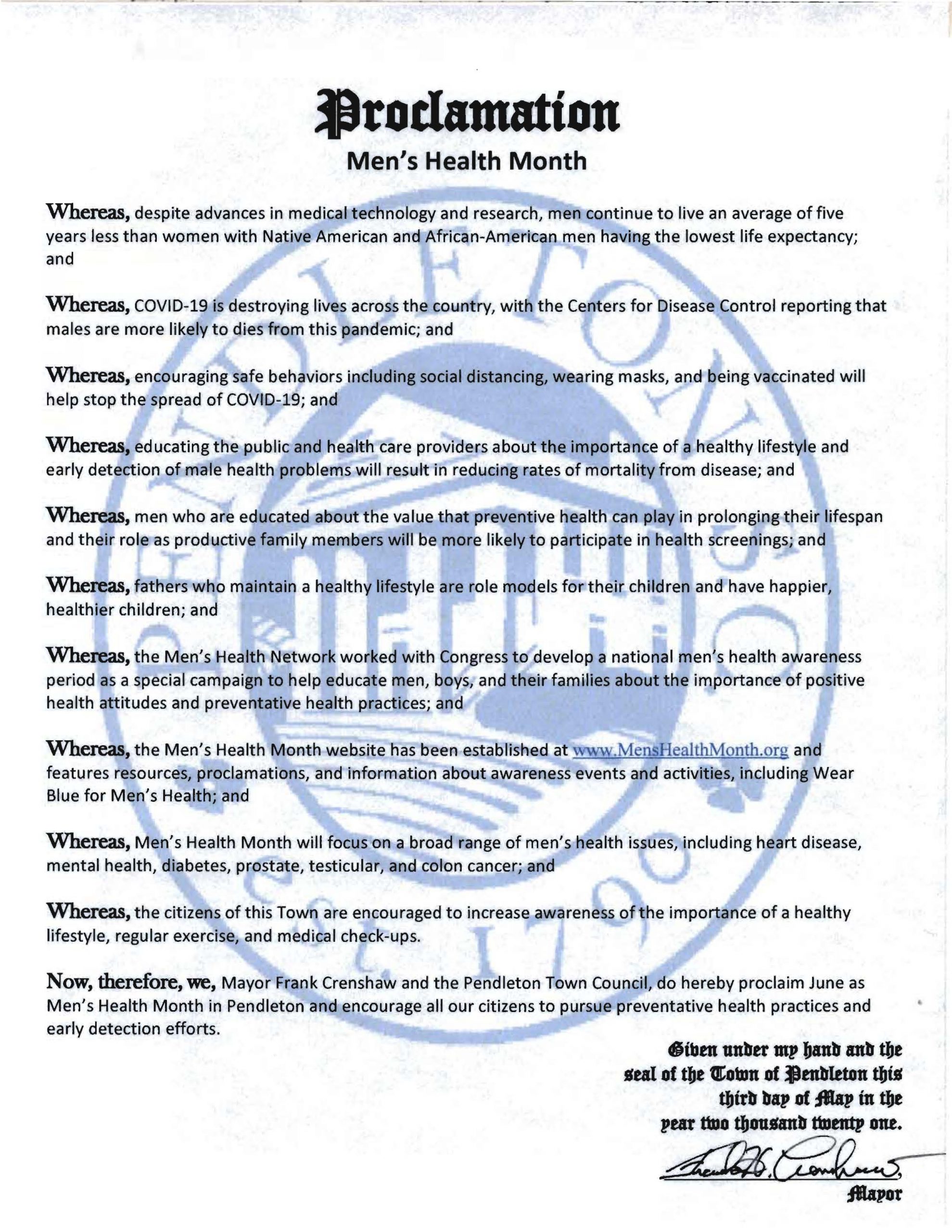 “Men’s Health impacts all of us. Not only men should worry about the seriousness of men’s health. It impacts mothers, wives, daughters, and sisters and is an entire family issue” said Pendleton Mayor Frank Crenshaw.