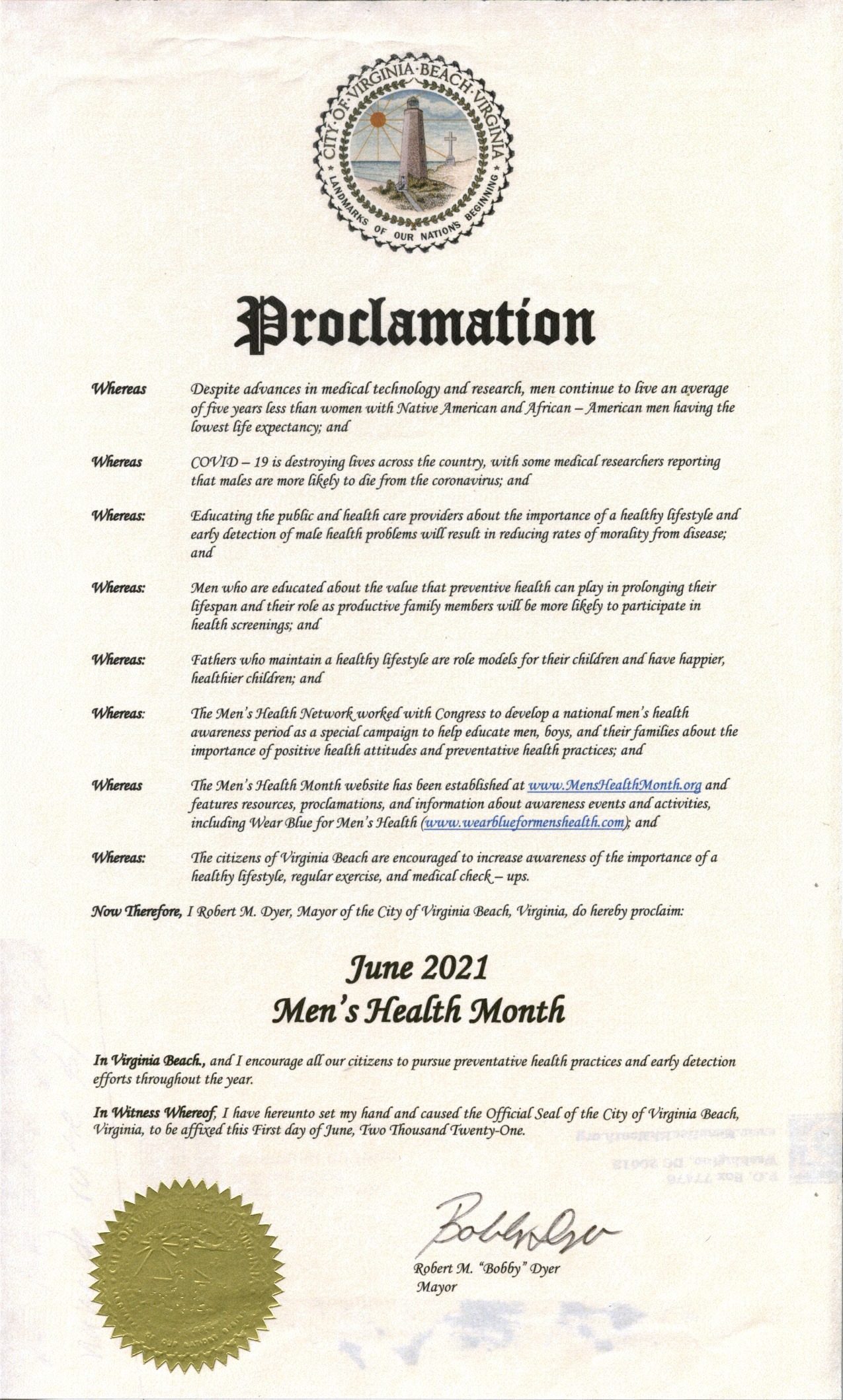 VIRGINIA, UNITED STATES, June 22, 2021 /EINPresswire.com/ -- The state of Virginia, as well as the cities Alexandria, Hampton, and Virginia Beach, have issued a proclamation celebrating men’s health and fatherhood in June, helping educate men, boys, and their families about disease prevention, timely screenings, healthy lifestyles, and positive family relationships.The proclamations can be found here.