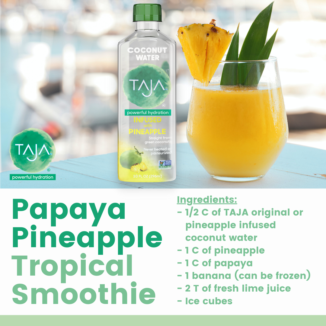 TAJA Coconut Waters are the perfect smoothie ingredient. They transform any and every beverage, completing it with TAJA’s deliciously distinct taste – a taste that instantly enhances its consumer’s favorite drinks. Among TAJA’s many smoothie recipes is its Papaya Pineapple Tropical Smoothie, of which the ingredients and instructions are included, both in an easy-to-follow video and image format.