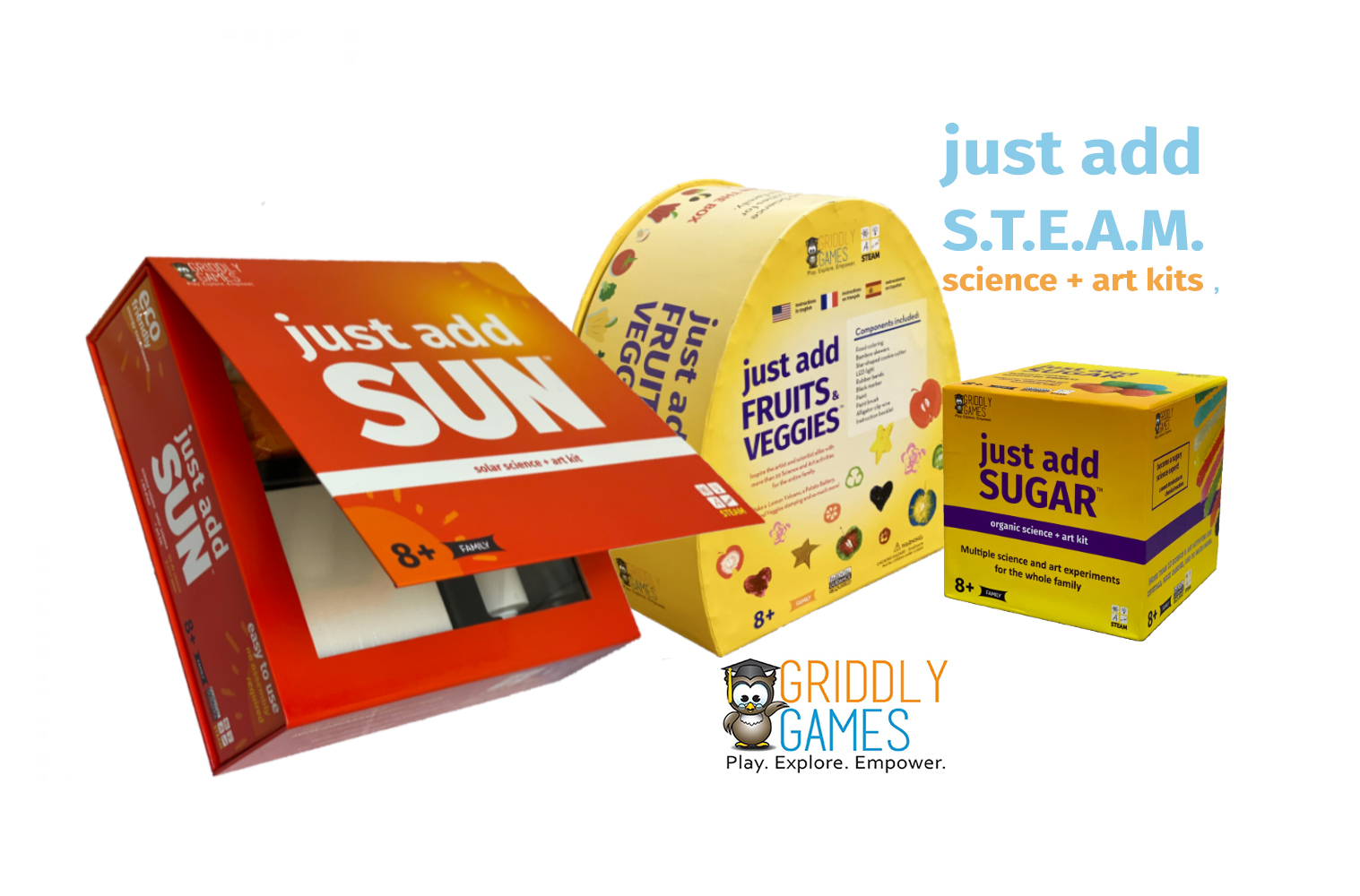 The Griddly Games signature “Just Add _(ingredient)__” line currently includes seven multi-award-winning STEAM (Science Technology Engineering Art Math) kits. The kits include science activity and art projects just by adding: Sun, Sugar, Glue, Milk, Egg, Baking Soda, and Fruits & Veggies.