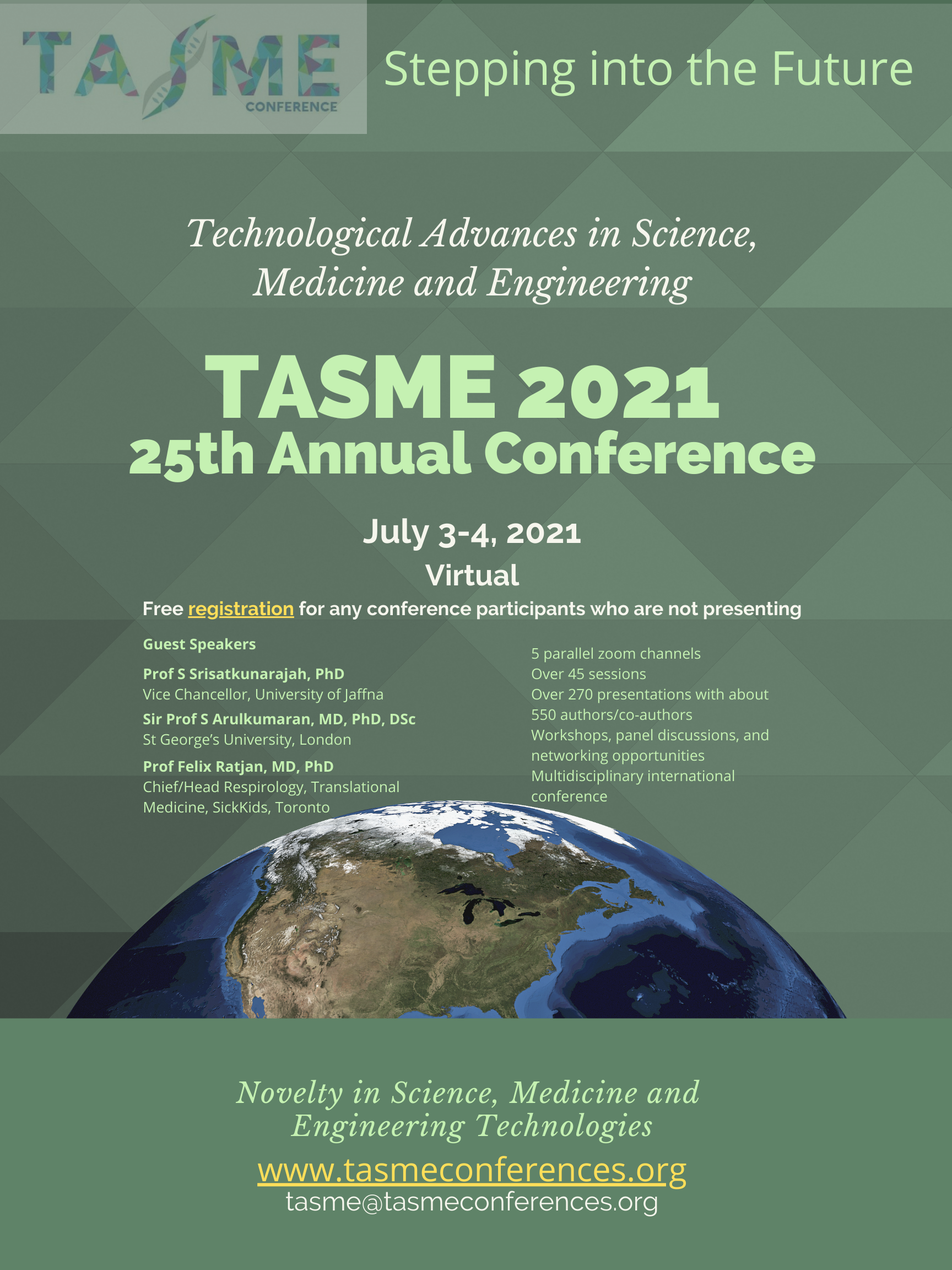 The 25th Technological Advances in Science, Medicine, and Engineering conference (TASME2021) will be held in virtual format on July 3-4, 2021. This is a unique international conference dedicated to highlight advancements in Science, Medicine, and Engineering. The aim of this conference is to bring researchers, professors and university students from both academia and industry together to share new knowledge, and foster and strengthen collaboration. This conference provides an ideal opportunity to meet fellow members from multidisciplinary scientific community.