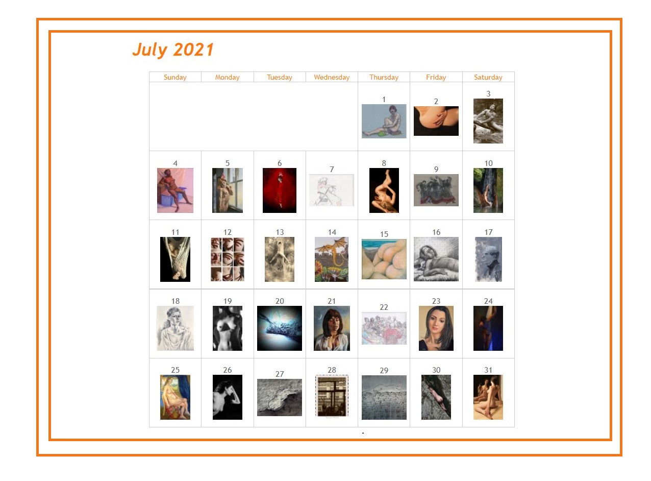 Each Barebrush calendar features contemporary artworks in various media. These include photos, oils, watercolor, mixed media, and sculpture. You see the beauty of art created by artists working today, revealed day by day. You see the tantalizing art of the nude. You get the words of the artists. Other art calendars use one image per month or week. Barebrush showcases unique artwork for each day of the month. The art of the day is yours to see, enjoy and treasure. On the Art-of-the-Day calendar page, you can see the current calendar art revealed over time.