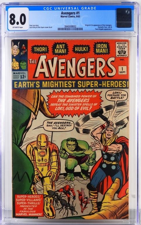 A strong candidate for top lot of the auction is the copy of Marvel Comics Avengers #1 (Sept. 1963), graded CGC 8.0 and featuring the origin and first appearance of the Avengers, plus appearances by the Fantastic Four, Loki and Teen Brigade. It has an estimate of $18,000-$24,000. Mr. Bruneau called it “the finest copy of Avengers #1 we have handled to date.”