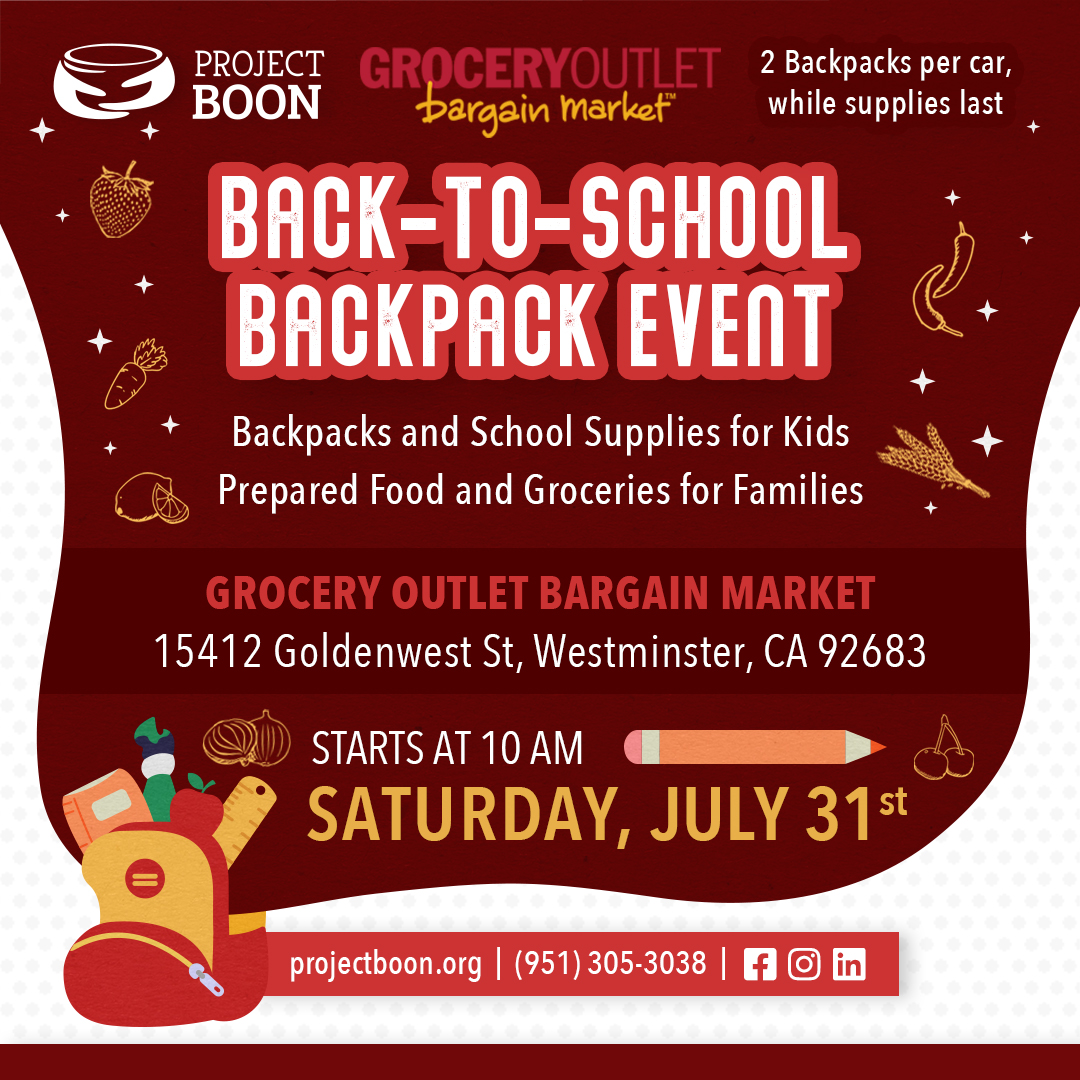 Project Boon announces the upcoming Back-to-School Backpack Event to be held at the Westminster Grocery Outlet Center on July 31, 2021.