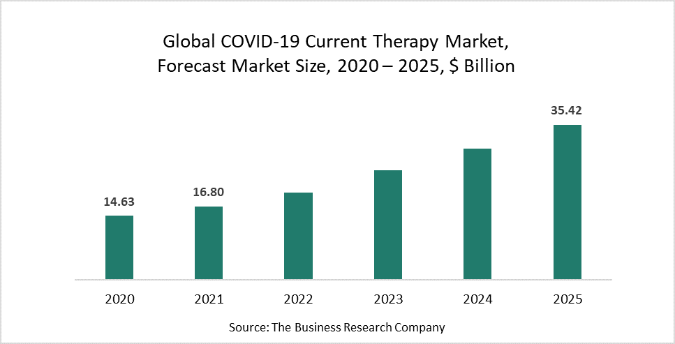 The global coronavirus (COVID-19) current therapy market size is expected to grow from $14.63 billion in 2020 to $16.8 billion in 2021 at a compound annual growth rate (CAGR) of 14.8%. The growth is mainly due to the companies resuming their operations and adapting to the new normal while recovering from the COVID-19 impact, which had earlier led to restrictive containment measures involving social distancing, remote working, and the closure of commercial activities that resulted in operational challenges. The COVID-19 current therapy market is expected to reach $35.42 billion in 2025 at a CAGR of 20%.
