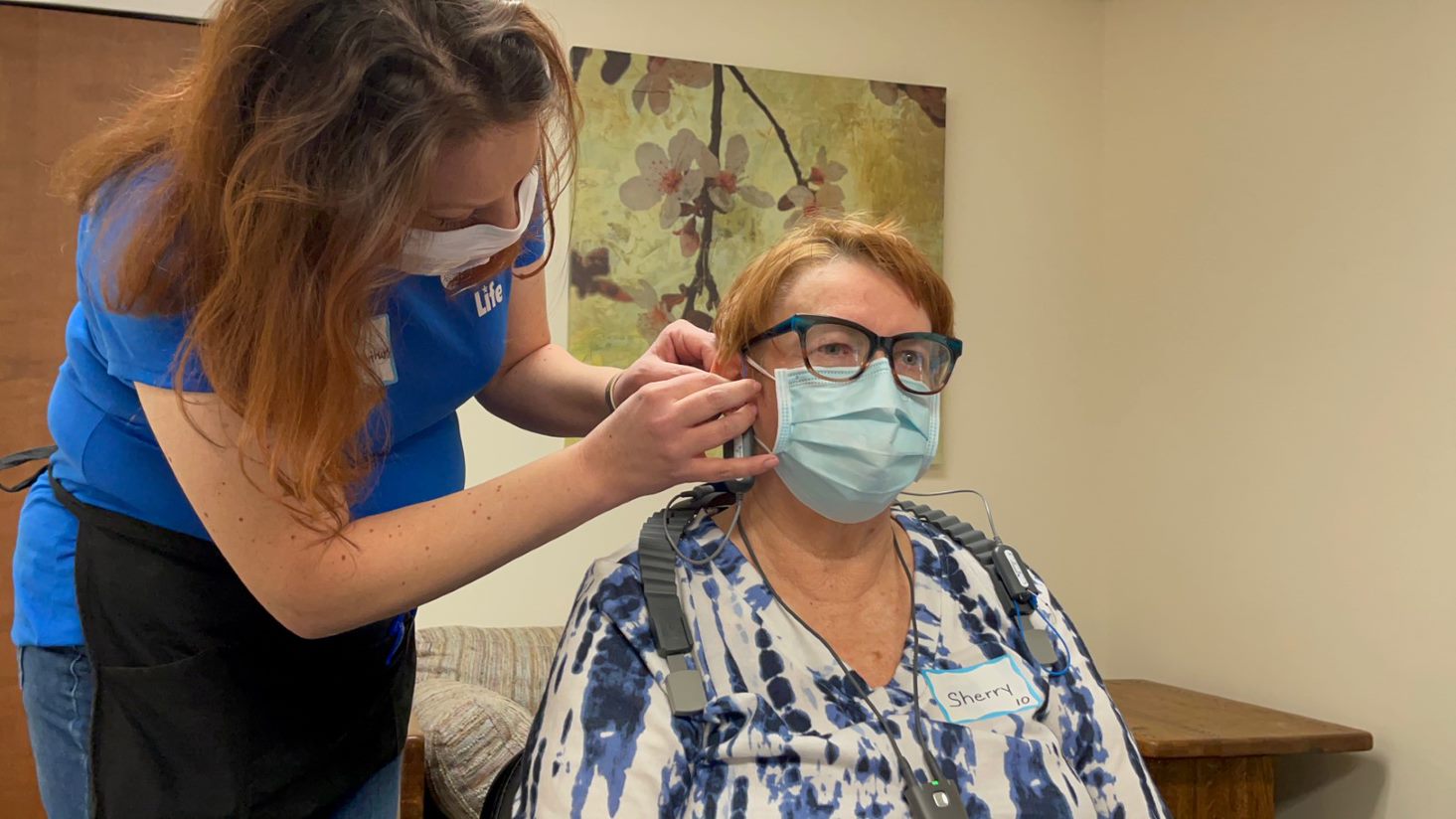 Marivel Mena, a young woman in her thirties, suffered from hearing loss and tinnitus in her right ear due to COVID. She had been struggling at work and home to figure out where sounds were coming from. As soon as her hearing aid was turned on, she noticed that her tinnitus was less noticeable, relieving her of her struggle at home and work.