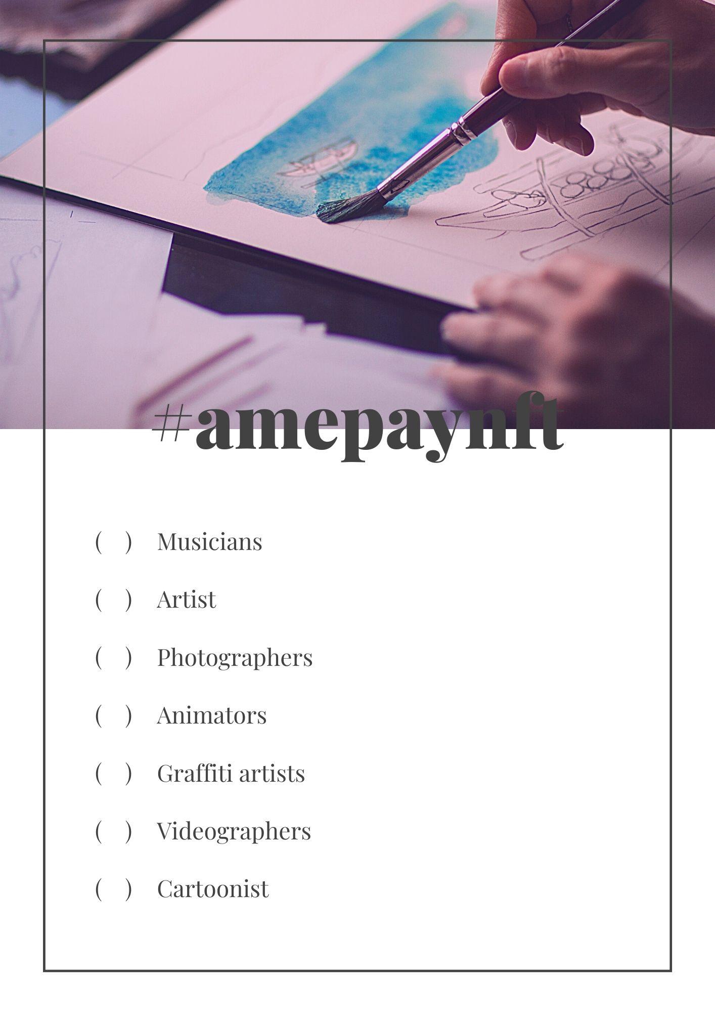 To address the commonly faced issues (inappropriate royalty and plagiarism), AMEPAY has ventured into NFT. AMEPAY NFT can be bought through AME & ETH.