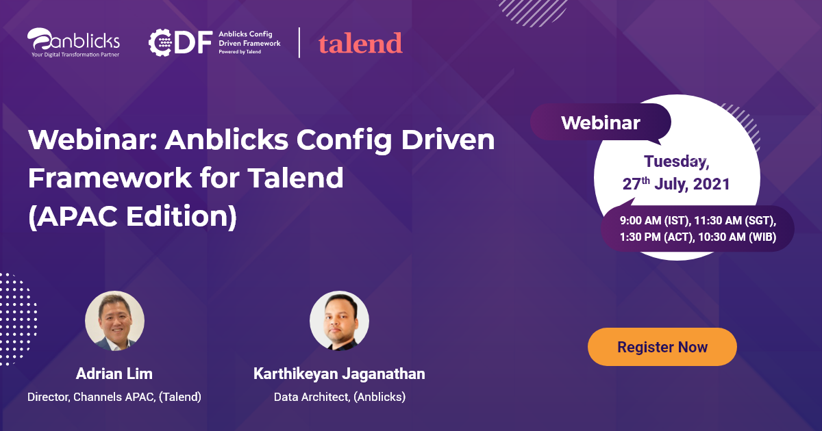 SINGAPORE, July 14, 2021 /EINPresswire.com/ -- Anblicks will be hosting its latest webinar titled "Anblicks Config Driven Framework (CDF) for Talend" on July 27, 2021. The webinar will be presented by Adrian Lim (Director, Channels APAC, Talend), and Karthikeyan Jaganathan (Data Architect, BI & Integration, Anblicks).Anblicks Config Driven Framework (CDF) is a simplified low code ETL framework, which helps you to add new data sources and data integration pipelines nearly automatically, requiring little or no input from developers. CDF improves performance by configurable task parallelization and provides insightful proactive operational dashboards to mitigate failures. CDF is powered by Talend Data Fabric, which combines data integration, integrity, and governance in a single, unified platform.
