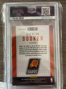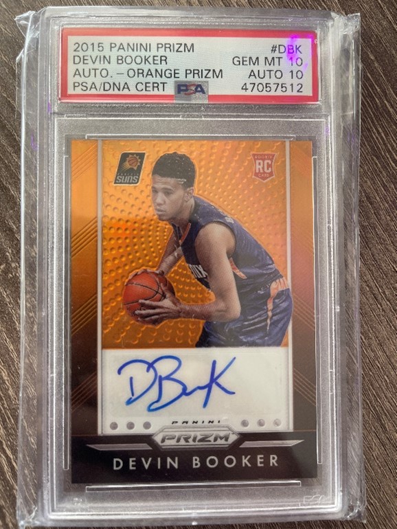 “Currently listed as of Monday, July 12th, is a rare 2015 Panini Prizm Autographed Devin Booker Orange Prizm card serial numbered to just /65,” Mess continues. “What makes this card magnificent is the fact its graded from PSA as a 10, and a 10 autograph, making this the only card on the planet with these credentials. The Orange background is a rare find, that goes beautifully with the Phoenix Suns uniform. This card was purchased for just over $15,000, and I expect it to sell for somewhere in the 20k range. This would be a steal for a collector looking to commemorate the Phoenix Suns run this year. If this were a Luka Doncic card it would already be worth over $100,000 without a question. Devin Booker, who is just becoming a household name, is on the brink of an NBA Championship and is dating A-list celebrity Kendall Jenner of Keeping Up with The Kardashians. This means his stock is on the rise.”